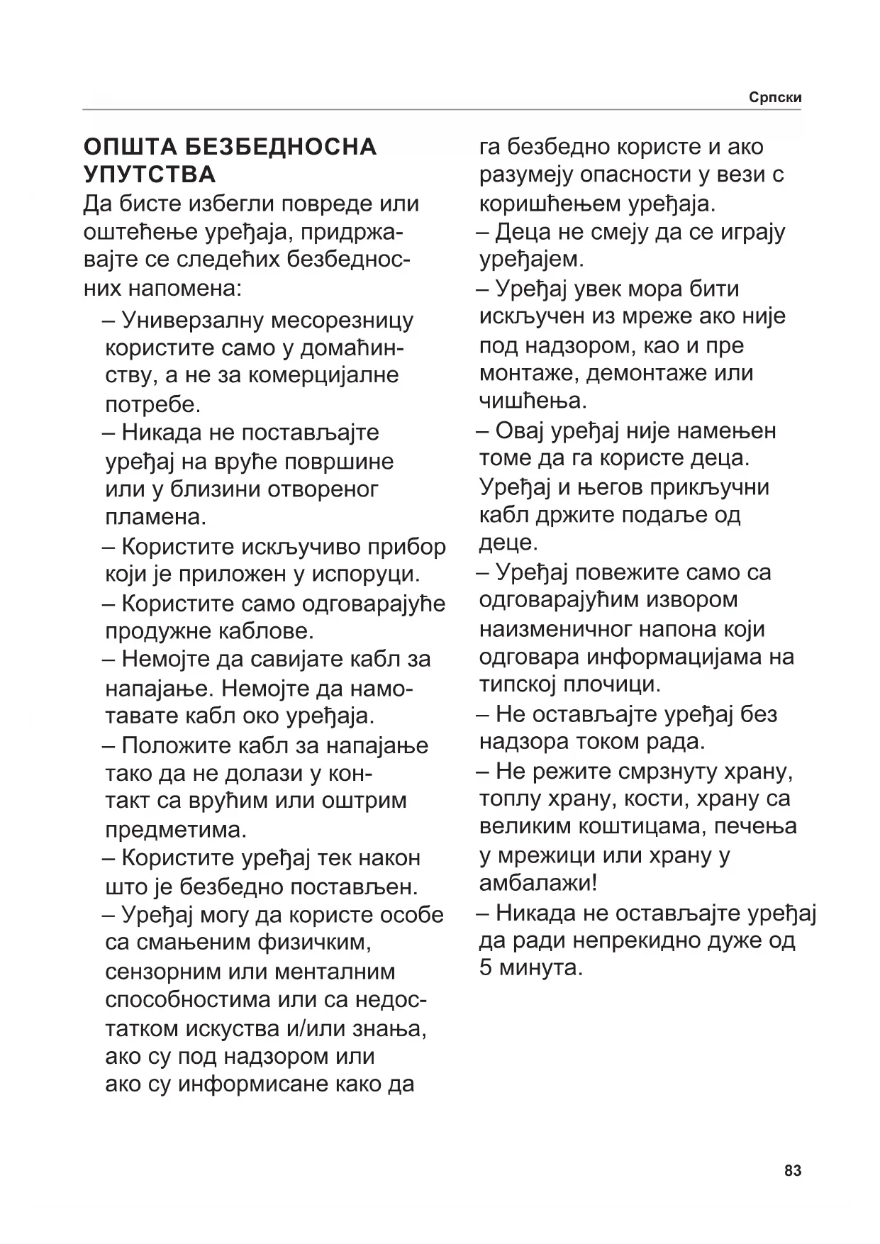 Да бисте избегли повреде или оштећење уређаја, придржа- вајте се следећих безбеднос- них напомена: – Универзалну месорезницу користите само у домаћин- ству, а не за комерцијалне