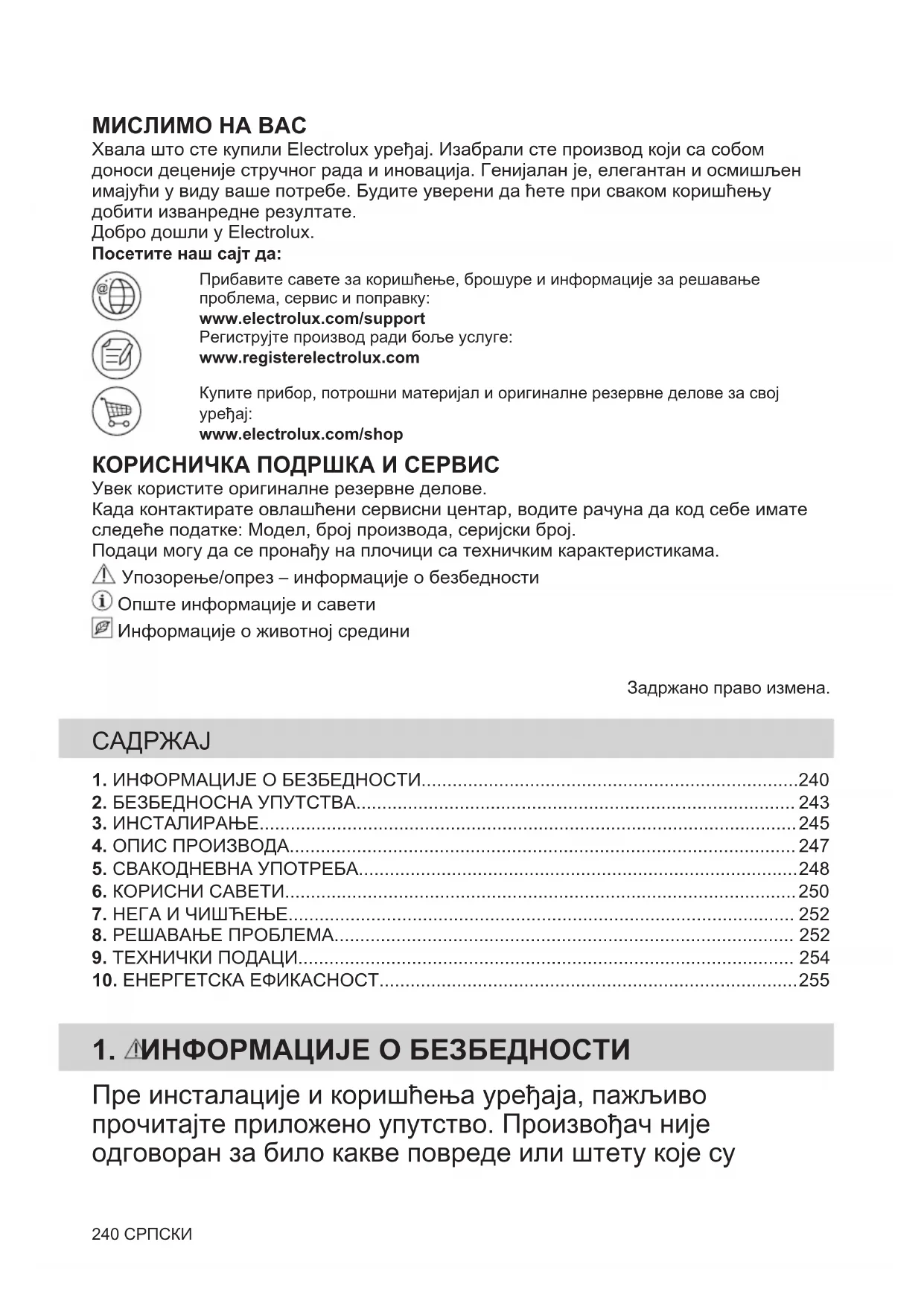 Reciclaţi materialele marcate cu simbolul . Pentru a recicla ambalajele, acestea trebuie puse în containerele corespunzătoare. Ajutaţi la protejarea mediului şi a sănătăţii umane şi la reciclarea deşeurilor din aparatele electrice şi electrocasnice. Nu aruncaţi aparatele marcate cu acest simbol împreună cu deşeurile menajere. Returnaţi produsul la centrul local de reciclare sau contactaţi administraţia oraşului dvs. ROMÂNA 239МИСЛИМО НА ВАС Хвала што сте купили Electrolux уређај. Изабрали сте производ који са собом доноси деценије стручног рада и иновација. Генијалан је, елегантан и осмишљен имајући у виду ваше потребе. Будите уверени да ћете при сваком коришћењу добити изванредне резултате. Добро дошли у Electrolux. Посетите наш сајт да:Прибавите савете за коришћење, брошуре и информације за решавањепроблема, сервис и поправку:www.electrolux.com/supportРегиструјте производ ради боље услуге:www.registerelectrolux.comКупите прибор, потрошни материјал и оригиналне резервне делове за својуређај:www.electrolux.com/shop КОРИСНИЧКА ПОДРШКА И СЕРВИС Увек користите оригиналне резервне делове. Када контактирате овлашћени сервисни центар, водите рачуна да код себе имате следеће податке: Модел, број производа, серијски број. Подаци могу да се пронађу на плочици са техничким карактеристикама. Упозорење/опрез – информације о безбедности Опште информације и савети Информације о животној средини Задржано право измена.
