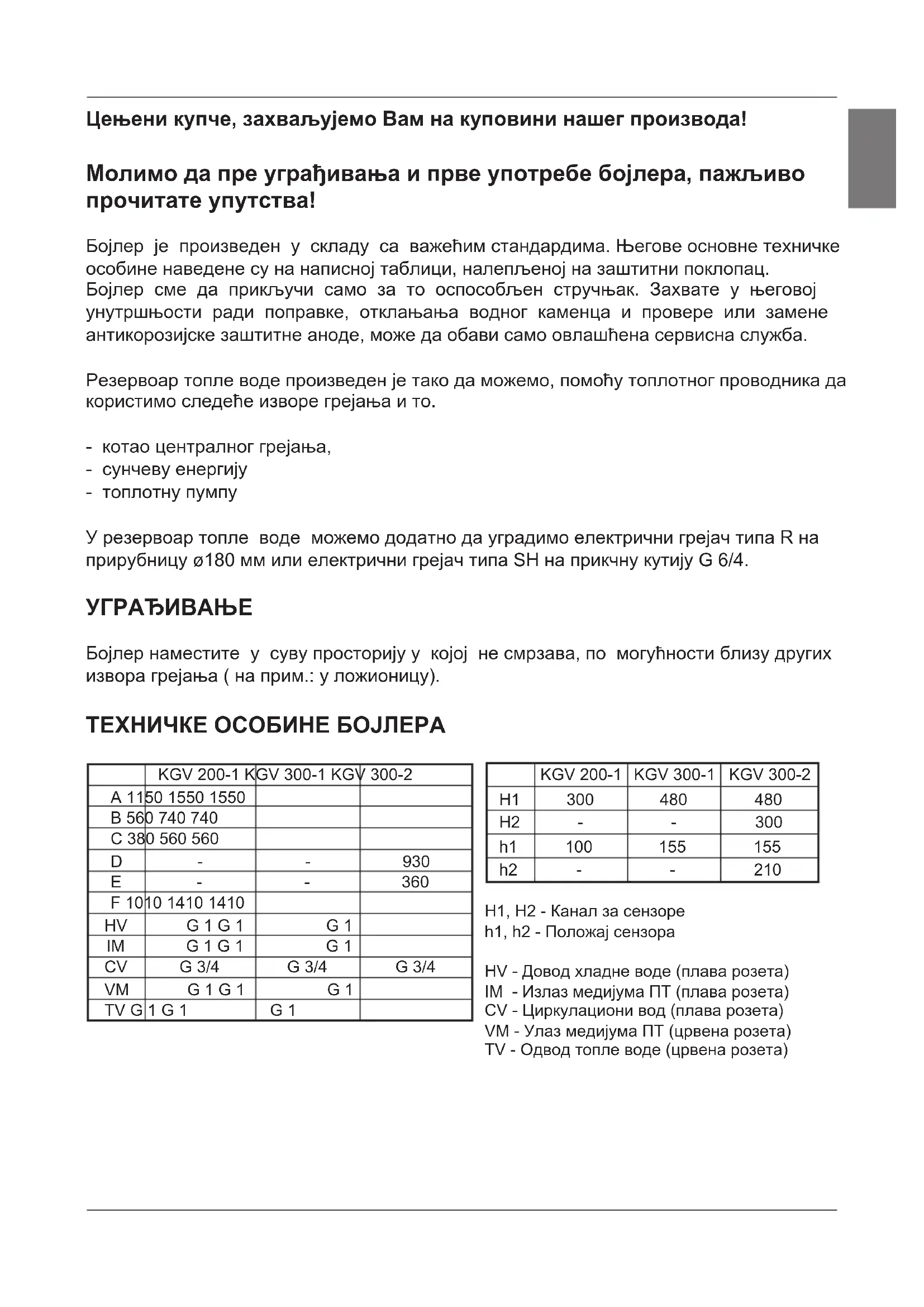 H1 300 480 480 H2 - - 300 h1 100 155 155 h2 - - 210 H1, H2 - Канал за сензоре h1, h2 - Положај сензора HV - Довод хладне воде (плава розета) IM - Излаз медијума ПТ (плава розета) CV - Циркулациони вод (плава розета) VM - Улаз медијума ПТ (црвена розета) TV - Одвод топле воде (црвена розета)¦ª Тип KGV 200-1 KGV 300-1 KGV 300-2 Запремина [l] 200 285 280 Називни притисак [Mpa] 0,6 Тежина / напуњен водом [kg] 82 / 282 112 / 397 134 / 414 Антикорозивна заштита котла емајлирано / Мг анода Грејна површина ПТ- доња [m²] Грејна површина ПТ-горња [m²] Дебљина изолације [mm] 57 Степен заштите IP 21 ПТ - преиоснлац топлоте На задњој страни резервоара топле воде израђени су канали за сензоре (H1, H2), где могу да се уметну сензори за регулацију системске везе резервоара са другим изворима грејања. Приступ каналима се налази испод заштитног омотача, приближно на половини висине резервоара топле воде. Сензор наместите у канал и причврстите приложеним гуменим чепом. Препоручен положај сензора (h1, h2) у каналима означен је на скици: - Ако сензор будете наместили више од препорученог положаја, термостат ће брже реаговати, интервали деловања топлотне пумпе биће краћи, разлика између температуре воде у резервоару и огреваним медијима после искључења термостата биће виша, а као последица, количина и температура топле воде у резервоару биће