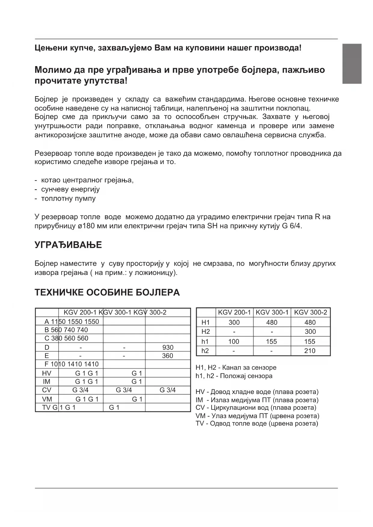 H1 300 480 480 H2 - - 300 h1 100 155 155 h2 - - 210 H1, H2 - Канал за сензоре h1, h2 - Положај сензора HV - Довод хладне воде (плава розета) IM - Излаз медијума ПТ (плава розета) CV - Циркулациони вод (плава розета) VM - Улаз медијума ПТ (црвена розета) TV - Одвод топле воде (црвена розета)¦ª Тип KGV 200-1 KGV 300-1 KGV 300-2 Запремина [l] 200 285 280 Називни притисак [Mpa] 0,6 Тежина / напуњен водом [kg] 82 / 282 112 / 397 134 / 414 Антикорозивна заштита котла емајлирано / Мг анода Грејна површина ПТ- доња [m²] Грејна површина ПТ-горња [m²] Дебљина изолације [mm] 57 Степен заштите IP 21 ПТ - преиоснлац топлоте На задњој страни резервоара топле воде израђени су канали за сензоре (H1, H2), где могу да се уметну сензори за регулацију системске везе резервоара са другим изворима грејања. Приступ каналима се налази испод заштитног омотача, приближно на половини висине резервоара топле воде. Сензор наместите у канал и причврстите приложеним гуменим чепом. Препоручен положај сензора (h1, h2) у каналима означен је на скици: - Ако сензор будете наместили више од препорученог положаја, термостат ће брже реаговати, интервали деловања топлотне пумпе биће краћи, разлика између температуре воде у резервоару и огреваним медијима после искључења термостата биће виша, а као последица, количина и температура топле воде у резервоару биће
