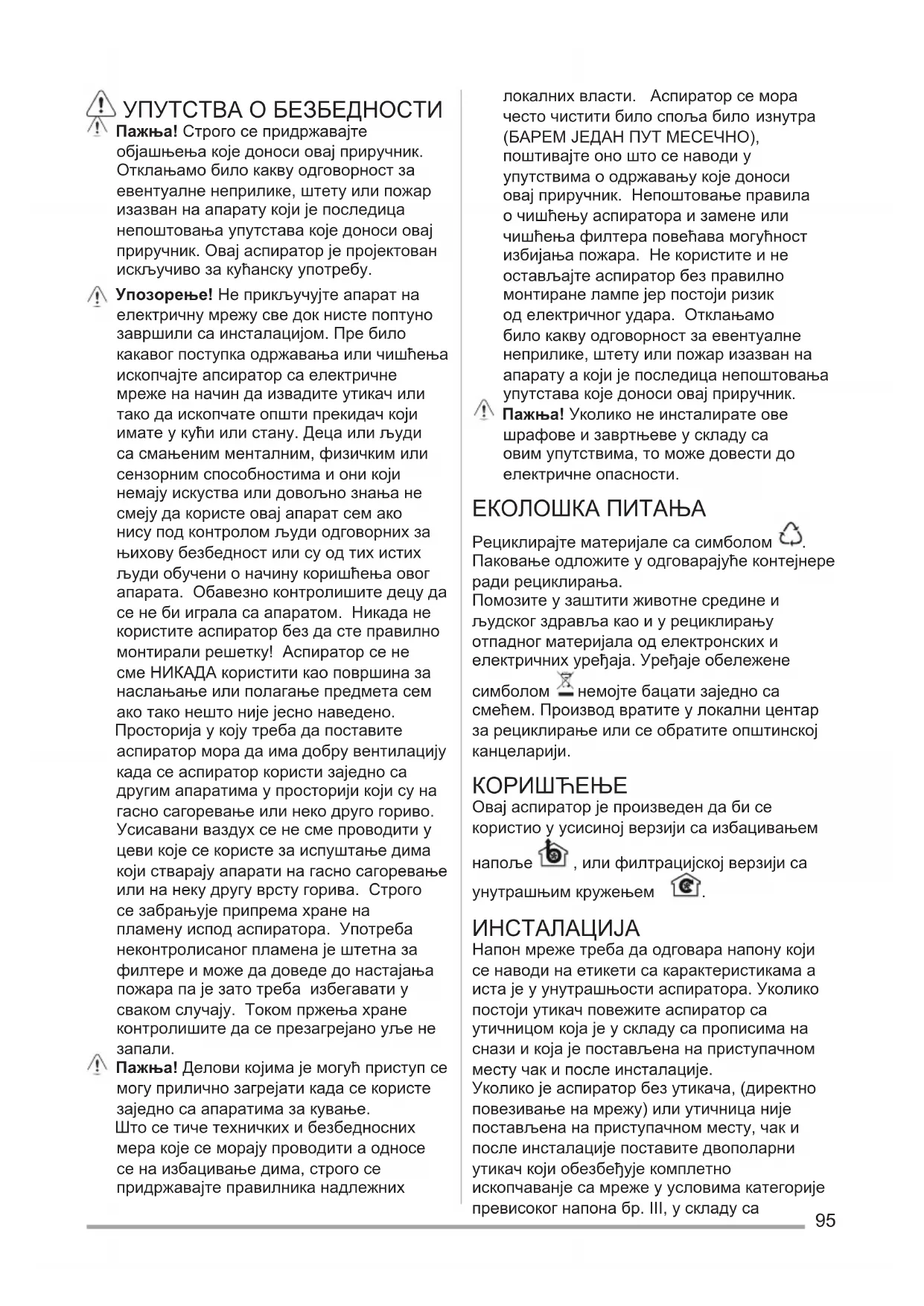 (БАРЕМ ЈЕДАН ПУТ МЕСЕЧНО), поштивајте оно што се наводи у упутствима о одржавању које доноси овај приручник. Непоштовање правила о чишћењу аспиратора и замене или чишћења филтера повећава могућност избијања пожара. Не користите и не остављајте аспиратор без правилно монтиране лампе јер постоји ризик од електричног удара. Отклањамо било какву одговорност за евентуалне неприлике, штету или пожар изазван на апарату а који је последица непоштовања упутстава које доноси овај приручник. Пажња! Уколико не инсталирате ове шрафове и завртњеве у складу са овим упутствима, то може довести до електричне опасности. ЕКОЛОШКА ПИТАЊА Рециклирајте материјале са симболом . Паковање одложите у одговарајуће контејнере ради рециклирања. Помозите у заштити животне средине и људског здравља као и у рециклирању отпадног материјала од електронских и електричних уређаја. Уређаје обележене симболом немојте бацати заједно са смећем. Производ вратите у локални центар за рециклирање или се обратите општинској канцеларији.
