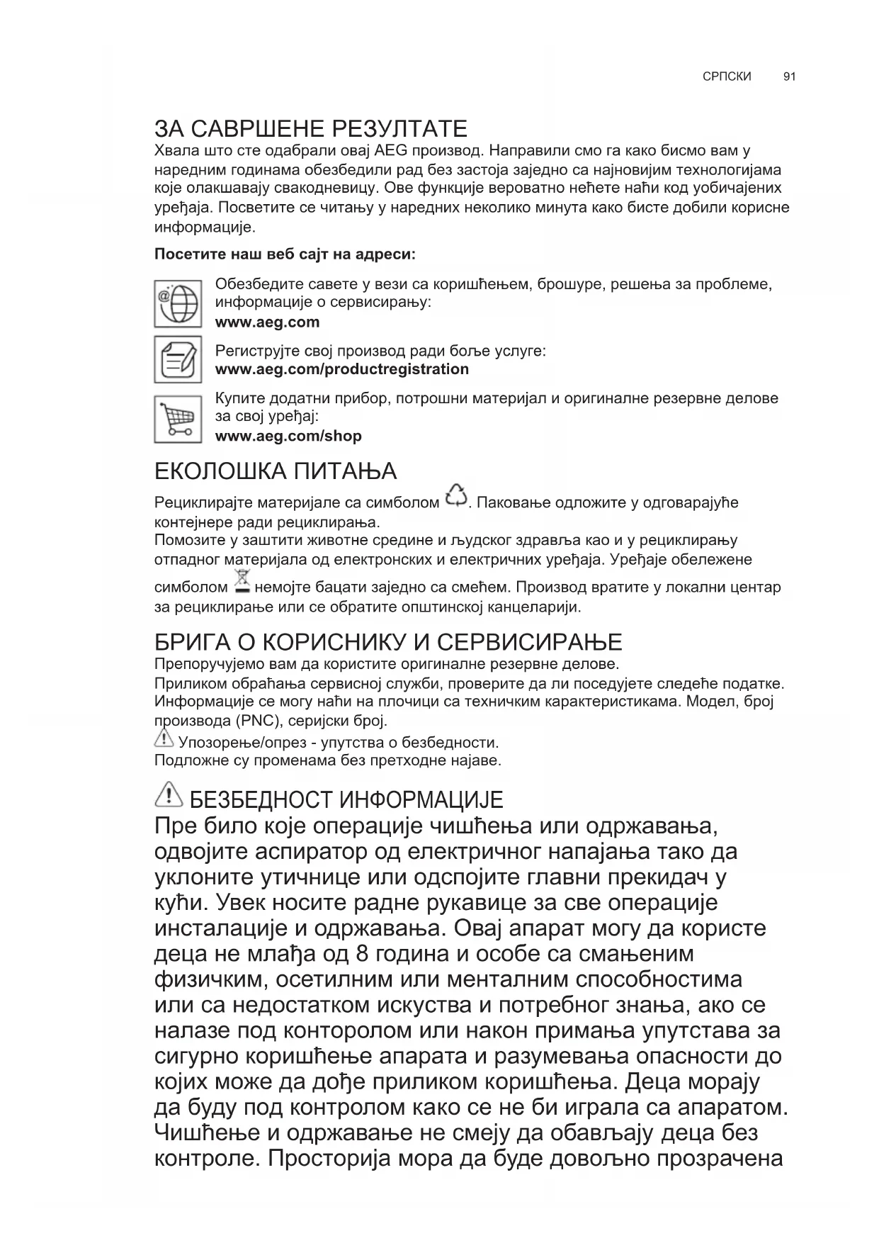 ЗА САВРШЕНЕ РЕЗУЛТАТЕ Хвала што сте одабрали овај AEG производ. Направили смо га како бисмо вам у наредним годинама обезбедили рад без застоја заједно са најновијим технологијама које олакшавају свакодневицу. Ове функције вероватно нећете наћи код уобичајених уређаја. Посветите се читању у наредних неколико минута како бисте добили корисне информације. Посетите наш веб сајт на адреси: Обезбедите савете у вези са коришћењем, брошуре, решења за проблеме, информације о сервисирању: www.aeg.com Региструјте свој производ ради боље услуге: www.aeg.com/productregistration Купите додатни прибор, потрошни материјал и оригиналне резервне делове за свој уређај: www.aeg.com/shop ЕКОЛОШКА ПИТАЊА Рециклирајте материјале са симболом . Паковање одложите у одговарајуће контејнере ради рециклирања. Помозите у заштити животне средине и људског здравља као и у рециклирању отпадног материјала од електронских и електричних уређаја. Уређаје обележене симболом немојте бацати заједно са смећем. Производ вратите у локални центар за рециклирање или се обратите општинској канцеларији. БРИГА О КОРИСНИКУ И СЕРВИСИРАЊЕ Препоручујемо вам да користите оригиналне резервне делове. Приликом обраћања сервисној служби, проверите да ли поседујете следеће податке. Информације се могу наћи на плочици са техничким карактеристикама. Модел, број производа (PNC), серијски број. Упозорење/опрез - упутства о безбедности. Подложне су променама без претходне најаве. БЕЗБЕДНОСТ ИНФОРМАЦИЈЕ Пре било које операције чишћења или одржавања, одвојите аспиратор од електричног напајања тако да уклоните утичнице или одспојите главни прекидач у кући. Увек носите радне рукавице за све операције инсталације и одржавања. Овај апарат могу да користе деца не млађа од 8 година и особе са смањеним физичким, осетилним или менталним способностима или са недостатком искуства и потребног знања, ако се налазе под конторолом или након примања упутстава за сигурно коришћење апарата и разумевања опасности до којих може да дође приликом коришћења. Деца морају да буду под контролом како се не би играла са апаратом. Чишћење и одржавање не смеју да обављају