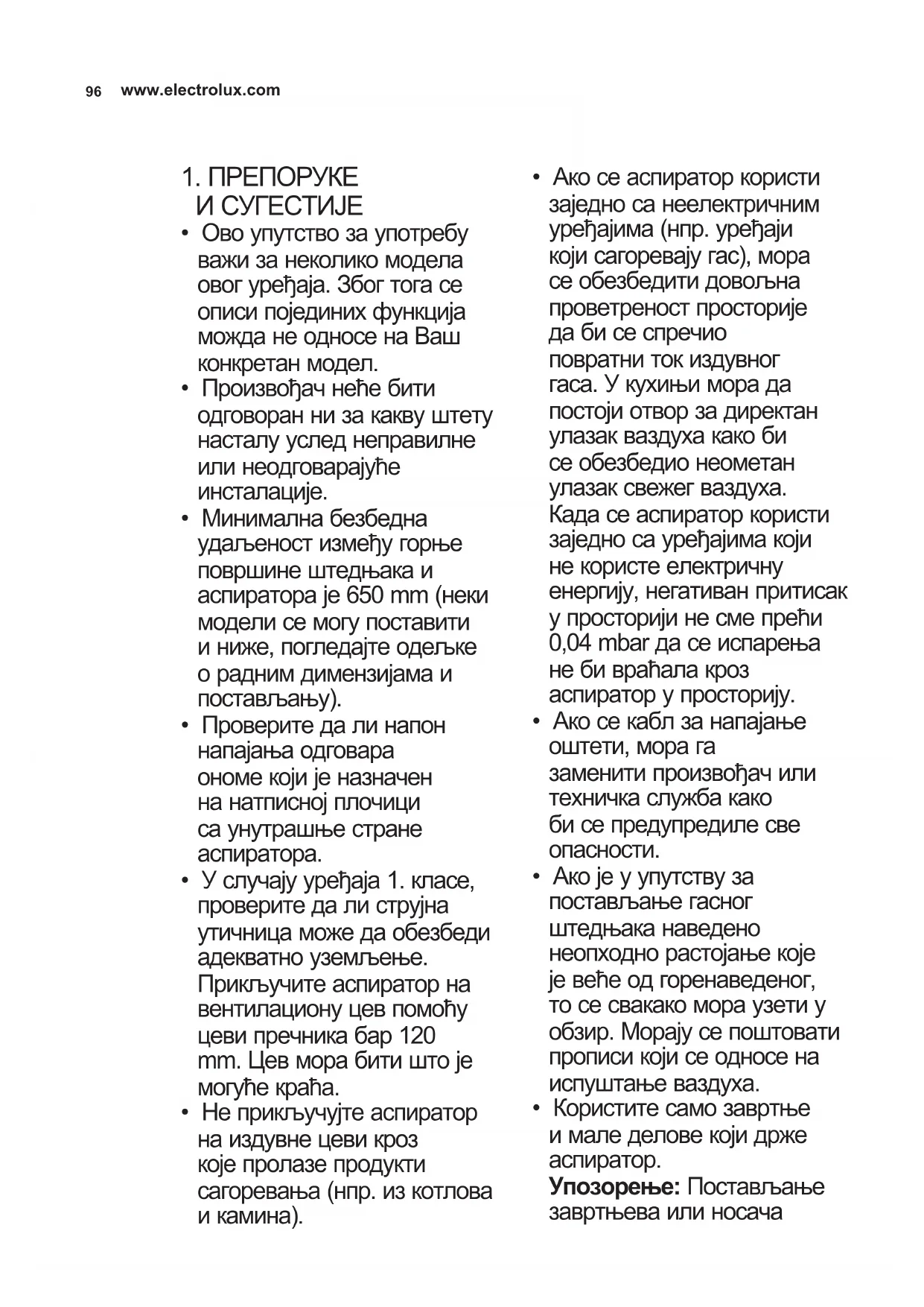 - Не прикључујте аспиратор на издувне цеви кроз које пролазе продукти сагоревања (нпр. из котлова