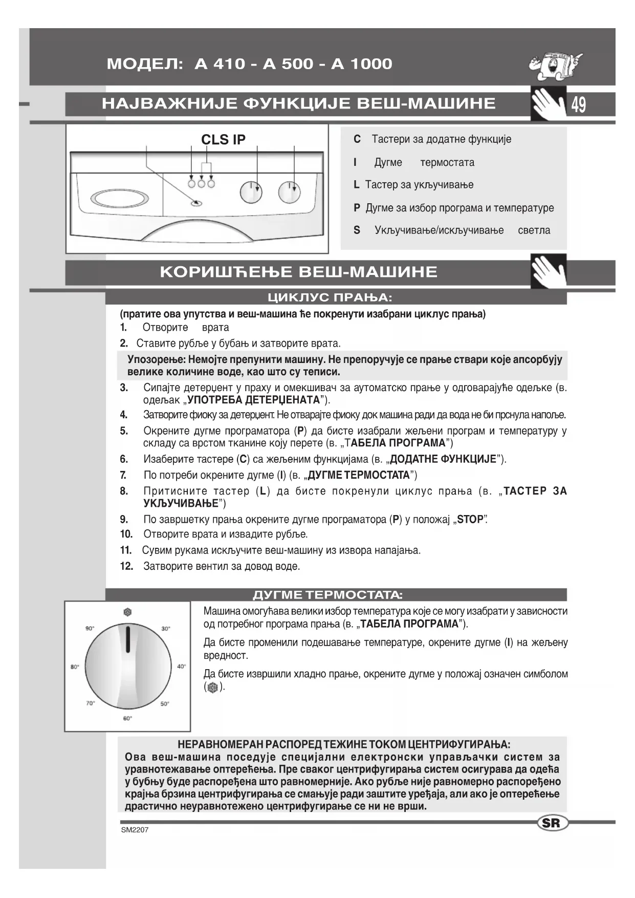 STOP СВЕТЛОСНИ ИНДИКАТОР: Индикатор је искључен када је дугме програматора у положају „STOP”. Индикатор стално светли током извршавања програма. Индикатор споро трепће након завршетка програма.ДУГМЕ ПРОГРАМАТОРА „STOP”: ДОДАТНЕ ФУНКЦИЈЕ Притисните овај тастер да бисте извршили кратко прање на температури до 40°C у трајању од око 10 минута. Ова функција се може користити само код програма „ПАМУК”, „СИНТЕТИКА” и „СВАКОДНЕВНО”. Напомена: Када користите ову опцију, детерџент се мора додати и у одговарајући одељак за претпрање.ПРЕТПРАЊЕ:Функција заустављања ресетује веш-машину. Ако из било ког разлога желите да промените програм прања или додате још рубља током циклуса прања, једноставно окрените дугме програматора у положај „STOP”. Затим вратите дугме на нови програм и притисните тастер за укључивање.Упозорење!! Ову функцију користите само ако је баш неопходна, а чак и тада само ако програм који прекидате ради већ најмање 3 минута. Након ресетовања машине сачекајте 2 минута пре него што отворите врата док се механизам за закључавање не откочи.Притисните овај тастер да започнете циклус прања.БЕЗ ЦЕНТРИФУГИРАЊА:Када притиснете овај тастер, веш-машина ће извршити циклус прања без завршног центрифугирања.Напомена: Коришћење ове функције зависи од изабраног програма. Последично, ако програм прања не садржи ову функцију, тастер неће бити омогућен (в. „ТАБЕЛА ПРОГРАМА”). ТАСТЕР ЗА УКЉУЧИВАЊЕ:51 SM2207 ТАБЕЛА ПРОГРАМА