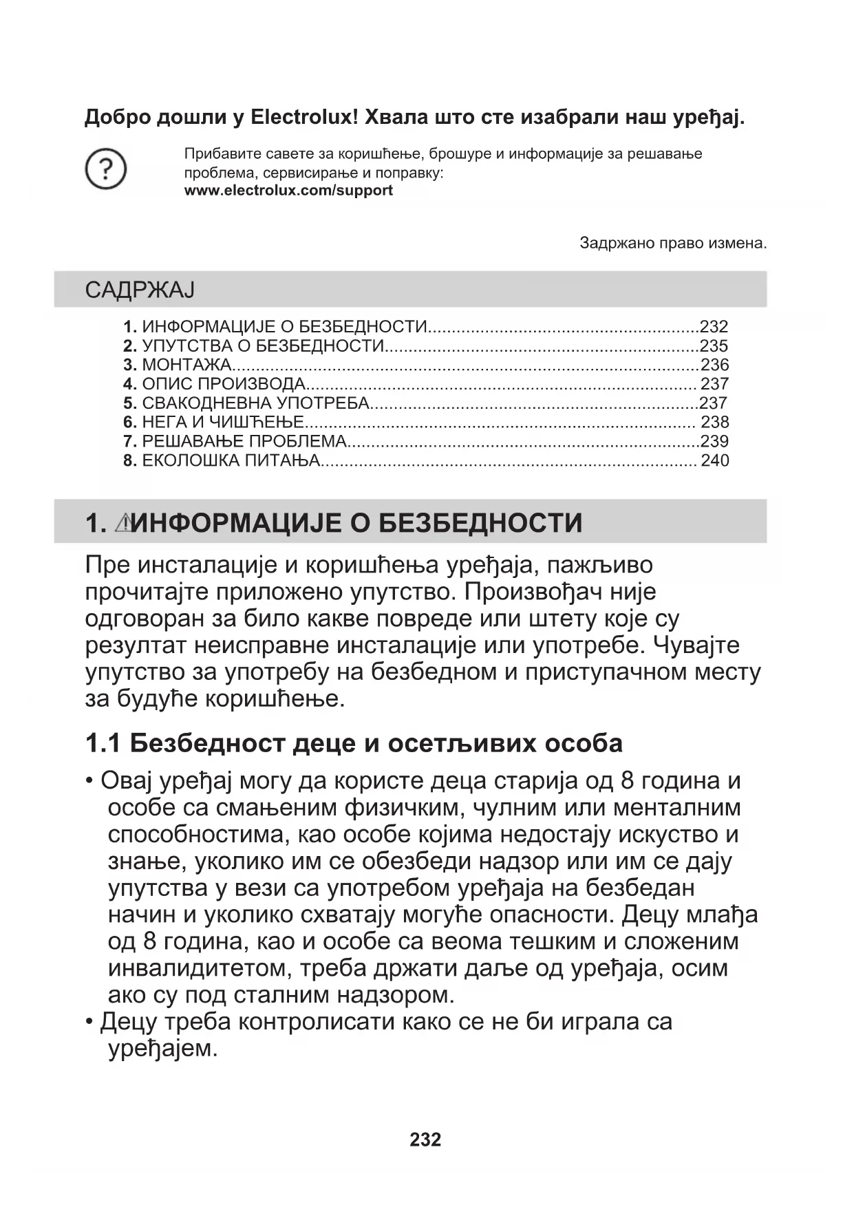 Рециклирајте материјале са симболом . Паковање одложите у одговарајуће контејнере ради рециклирања. Помозите у заштити животне средине и људског здравља као и у рециклирању отпадног материјала од електронских и електричних уређаја. Уређаје обележене симболом немојте бацати заједно са смећем. Производ вратите у локални центар за рециклирање или се обратите општинској канцеларији. 240Välkommen till Electrolux! Tack för att du har valt en av våra produkter. Få tips om användning, broschyrer, felsökning, service- och reparationsinformation:www.electrolux.com/supportMed reservation för ändringar. INNEHÅLL