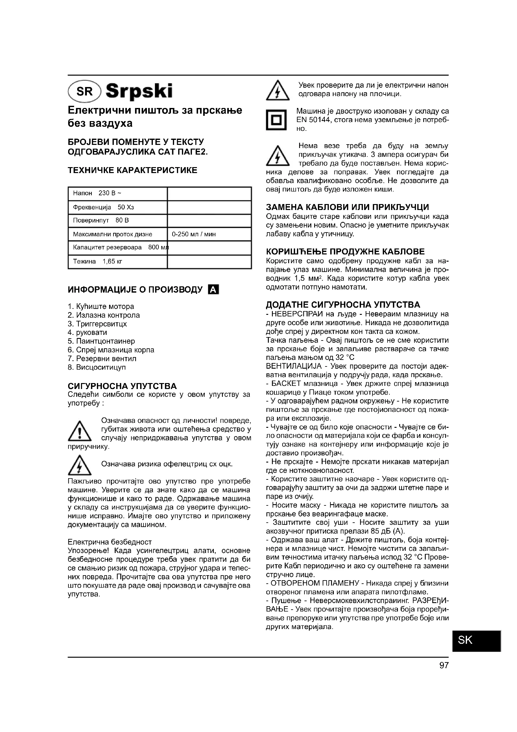 A97 Електрични пиштољ за прскање без ваздуха БРОЈЕВИ ПОМЕНУТЕ У ТЕКСТУ ОДГОВАРАЈУСЛИКА САТ ПАГЕ2. ТЕХНИЧКЕ КАРАКТЕРИСТИКЕ Напон 230 В ~ Фреквенција 50 Хз Поверинпут 80 В Максимални проток дизне 0-250 мл / мин Капацитет резервоара 800 мл Тежина 1,65 кг ИНФОРМАЦИЈЕ О ПРОИЗВОДУ А