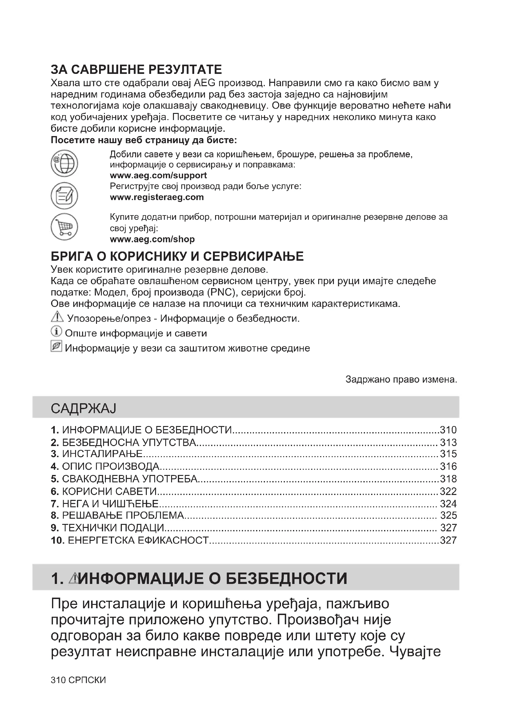 Resirkuler materialer som er merket med symbolet . Legg emballasjen i riktige beholdere for å resirkulere det. Bidrar til å beskytte miljøet, menneskers helse og for å resirkulere avfall av elektriske og elektroniske produkter. Ikke kast produkter som er merket med symbolet sammen med husholdningsavfallet. Produktet kan leveres der hvor tilsvarende produkt selges eller på miljøstasjonen i kommunen. Kontakt kommunen for nærmere opplysninger. NORSK 309ЗА САВРШЕНЕ РЕЗУЛТАТЕ Хвала што сте одабрали овај AEG производ. Направили смо га како бисмо вам у наредним годинама обезбедили рад без застоја заједно са најновијим технологијама које олакшавају свакодневицу. Ове функције вероватно нећете наћи код уобичајених уређаја. Посветите се читању у наредних неколико минута како бисте добили корисне информације. Посетите нашу веб страницу да бисте:Добили савете у вези са коришћењем, брошуре, решења за проблеме,информације о сервисирању и поправкама:www.aeg.com/supportРегиструјте свој производ ради боље услуге:www.registeraeg.comКупите додатни прибор, потрошни материјал и оригиналне резервне делове засвој уређај:www.aeg.com/shop БРИГА О КОРИСНИКУ И СЕРВИСИРАЊЕ Увек користите оригиналне резервне делове. Када се обраћате овлашћеном сервисном центру, увек при руци имајте следеће податке: Модел, број производа (PNC), серијски број. Ове информације се налазе на плочици са техничким карактеристикама. Упозорење/опрез - Информације о безбедности. Опште информације и савети Информације у вези са заштитом животне средине Задржано право измена.