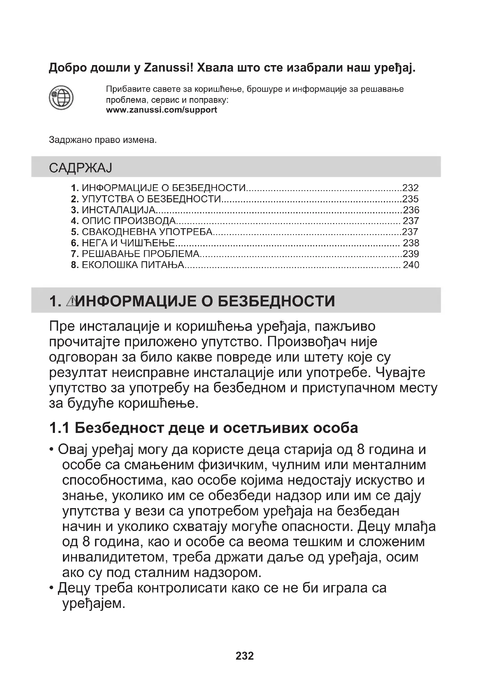 Рециклирајте материјале са симболом . Паковање одложите у одговарајуће контејнере ради рециклирања. Помозите у заштити животне средине и људског здравља као и у рециклирању отпадног материјала од електронских и електричних уређаја. Уређаје обележене симболом немојте бацати заједно са смећем. Производ вратите у локални центар за рециклирање или се обратите општинској канцеларији. 240Välkommen till Zanussi! Tack för att du har valt en av våra produkter. Få tips om användning, broschyrer, felsökning, service- och reparationsinformation:www.zanussi.com/supportMed reservation för ändringar. INNEHÅLL