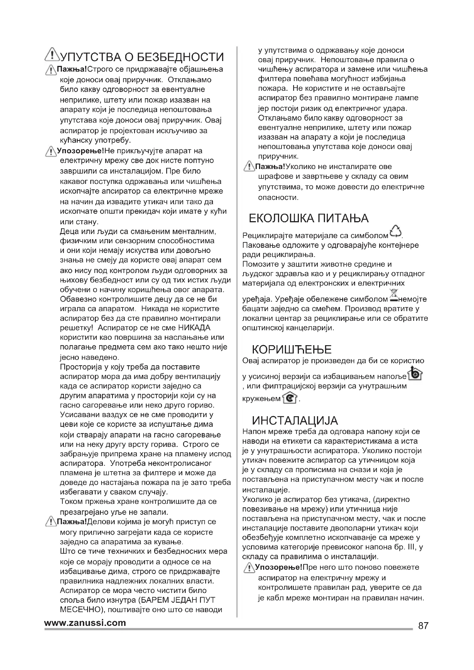 ИНСТАЛАЦИЈА Напон мреже треба да одговара напону који се наводи на етикети са карактеристикама а иста је у унутрашњости аспиратора. Уколико постоји утикач повежите аспиратор са утичницом која је у складу са прописима на снази и која је постављена на приступачном месту чак и после инсталације. Уколико је аспиратор без утикача, (директно повезивање на мрежу) или утичница није постављена на приступачном месту, чак и после инсталације поставите двополарни утикач који обезбеђује комплетно ископчаванје са мреже у условима категорије превисоког напона бр. III, у складу са правилима о инсталацији. Упозорење! Пре него што поново повежете аспиратор на електричну мрежу и контролишете правилан рад, уверите се да је кабл мреже монтиран на правилан начин.88 www.zanussi.com Минимална удаљеност између површине која служи за постављање посуде на уређај за кување не сме да буде мања од 43 цм када се ради о електричним кувалима и 65 цм када се ради о кувалима на гас или оним мешовитим. Уколико упутстава за инсталацију уређаја за кување на гас наводе већу удаљеност треба да се придржавате тих упутстава.