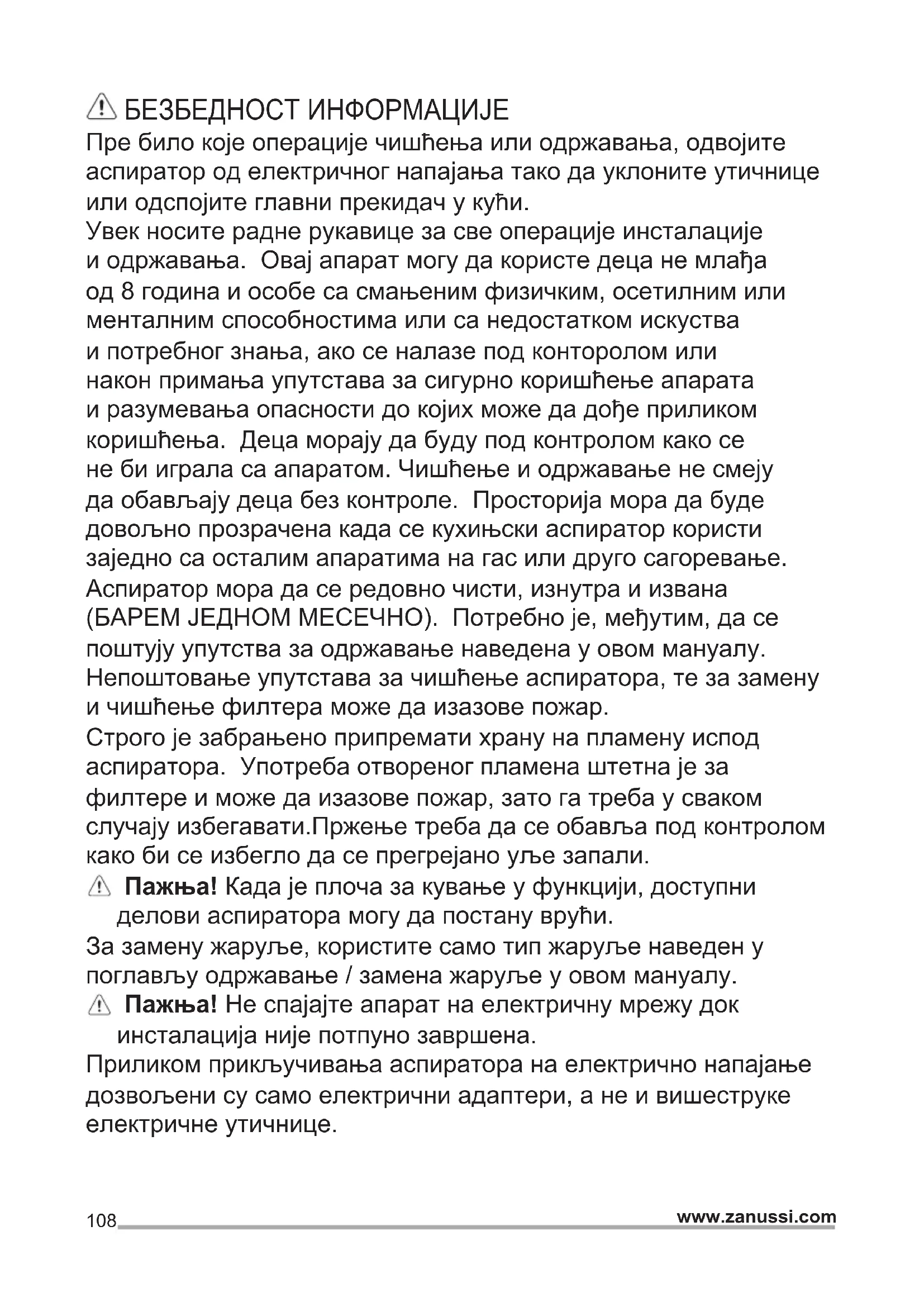 За нивната замена обратете се на службата за техничка поддршка.108 www.zanussi.com БЕЗБЕДНОСТ ИНФОРМАЦИЈЕ Пре било које операције чишћења или одржавања, одвојите аспиратор од електричног напајања тако да уклоните утичнице или одспојите главни прекидач у кући. Увек носите радне рукавице за све операције инсталације и одржавања. Овај апарат могу да користе деца не млађа од 8 година и особе са смањеним физичким, осетилним или менталним способностима или са недостатком искуства и потребног знања, ако се налазе под конторолом или након примања упутстава за сигурно коришћење апарата и разумевања опасности до којих може да дође приликом коришћења. Деца морају да буду под контролом како се не би играла са апаратом. Чишћење и одржавање не смеју да обављају деца без контроле. Просторија мора да буде довољно прозрачена када се кухињски аспиратор користи заједно са осталим апаратима на гас или друго сагоревање. Аспиратор мора да се редовно чисти, изнутра и извана (БАРЕМ ЈЕДНОМ МЕСЕЧНО). Потребно је, међутим, да се поштују упутства за одржавање наведена у овом мануалу. Непоштовање упутстава за чишћење аспиратора, те за замену и чишћење филтера може да изазове пожар. Строго је забрањено припремати храну на пламену испод аспиратора. Употреба отвореног пламена штетна је за филтере и може да изазове пожар, зато га треба у сваком случају избегавати.Пржење треба да се обавља под контролом како би се избегло да се прегрејано уље запали. Пажња! Када је плоча за кување у функцији, доступни делови аспиратора могу да постану врући. За замену жаруље, користите само тип жаруље наведен у поглављу одржавање / замена жаруље у овом мануалу. Пажња! Не спајајте апарат на електричну мрежу док инсталација није потпуно завршена. Приликом прикључивања аспиратора на електрично напајање дозвољени су само електрични адаптери, а не и вишеструке електричне утичнице.109 www.zanussi.com БЕЗБЕДНОСНА УПУТСТВА Што се тиче техничких мера и мера сигурности које морају се да предузму приликом испуштања пара, треба се строго придржавати одредби и прописа локалних власти. Испушни ваздух не сме да буде преношен каналом за испуштање пара произведених од стране апарата на гас или друго сагоревање. Немојте да користите или остављате аспиратор без правилно монтираних жаруља због могуће опасности од струјног удара. Никада не користите аспиратор без правилно монтиране мреже! Аспиратор се не сме НИКАДА користити као површина за одлагање, осим ако то није изричито наведено. Користите само шарафе за монтажу испоручене са производом, или, ако нису испоручени, купите правилну врсту шрафова. Користите правилну дужину за шарафе, наведену у Водичу за инсталацију. Ако сте у недоумици, обратите се овлашћеном сервису или сличном квалификованом особљу. ПАЖЊА! Неуспешна инсталација шарафа и затварача у складу са овим упутама, може да резултира опасностима електричне природе. ЕКОЛОШКА ПИТАЊА Рециклирајте материјале са симболом . Паковање одложите у одговарајуће контејнере ради рециклирања. Помозите у заштити животне средине и људског здравља као и у рециклирању отпадног материјала од електронских и електричних уређаја. Уређаје обележене симболом немојте бацати заједно са смећем. Производ вратите у локални центар за рециклирање или се обратите општинској канцеларији.