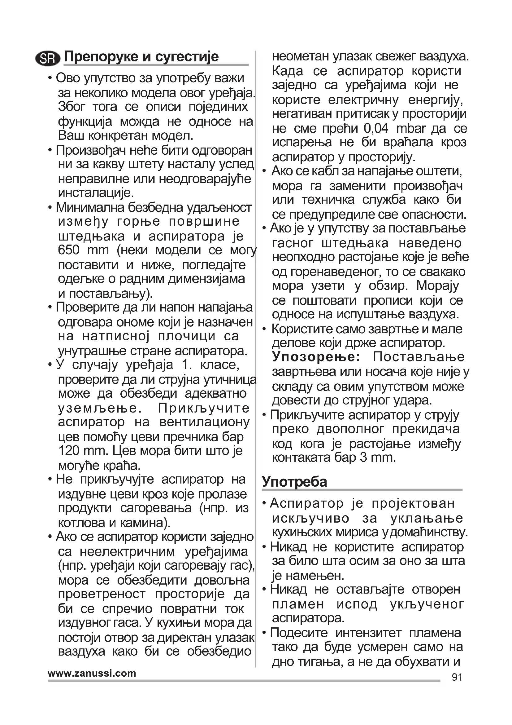 - Не прикључујте аспиратор на издувне цеви кроз које пролазе продукти сагоревања (нпр. из котлова и камина).