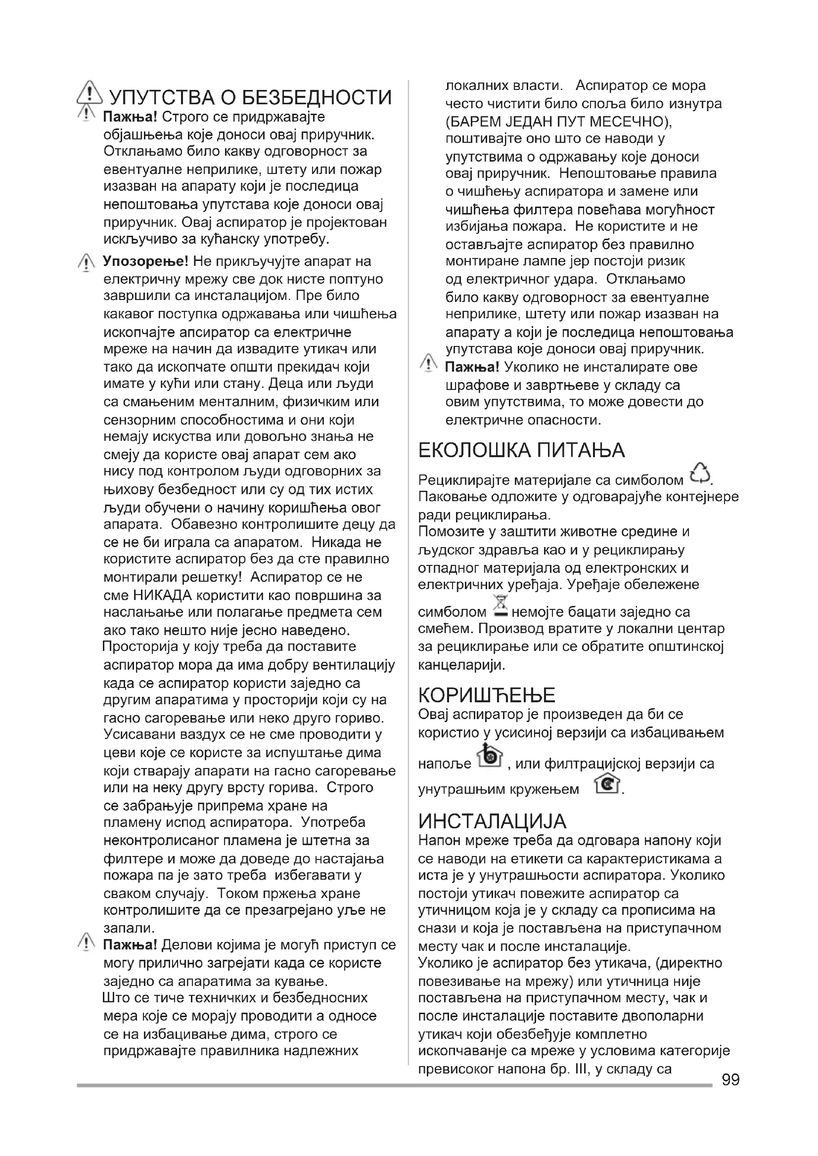 (БАРЕМ ЈЕДАН ПУТ МЕСЕЧНО), поштивајте оно што се наводи у упутствима о одржавању које доноси овај приручник. Непоштовање правила о чишћењу аспиратора и замене или чишћења филтера повећава могућност избијања пожара. Не користите и не остављајте аспиратор без правилно монтиране лампе јер постоји ризик од електричног удара. Отклањамо било какву одговорност за евентуалне неприлике, штету или пожар изазван на апарату а који је последица непоштовања упутстава које доноси овај приручник. Пажња! Уколико не инсталирате ове шрафове и завртњеве у складу са овим упутствима, то може довести до електричне опасности. ЕКОЛОШКА ПИТАЊА Рециклирајте материјале са симболом . Паковање одложите у одговарајуће контејнере ради рециклирања. Помозите у заштити животне средине и људског здравља као и у рециклирању отпадног материјала од електронских и електричних уређаја. Уређаје обележене симболом немојте бацати заједно са смећем. Производ вратите у локални центар за рециклирање или се обратите општинској канцеларији.