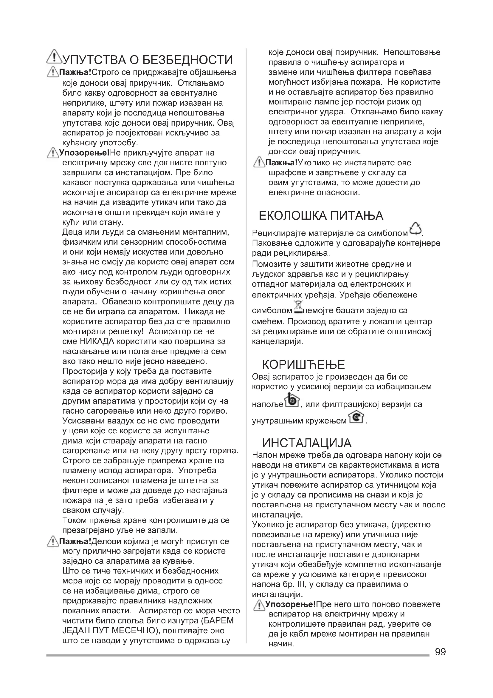 одговорност за евентуалне неприлике, штету или пожар изазван на апарату а који је последица непоштовања упутстава које доноси овај приручник. Пажња! Уколико не инсталирате ове шрафове и завртњеве у складу са овим упутствима, то може довести до електричне опасности. ЕКОЛОШКА ПИТАЊА Рециклирајте материјале са симболом . Паковање одложите у одговарајуће контејнере ради рециклирања. Помозите у заштити животне средине и људског здравља као и у рециклирању отпадног материјала од електронских и електричних уређаја. Уређаје обележене