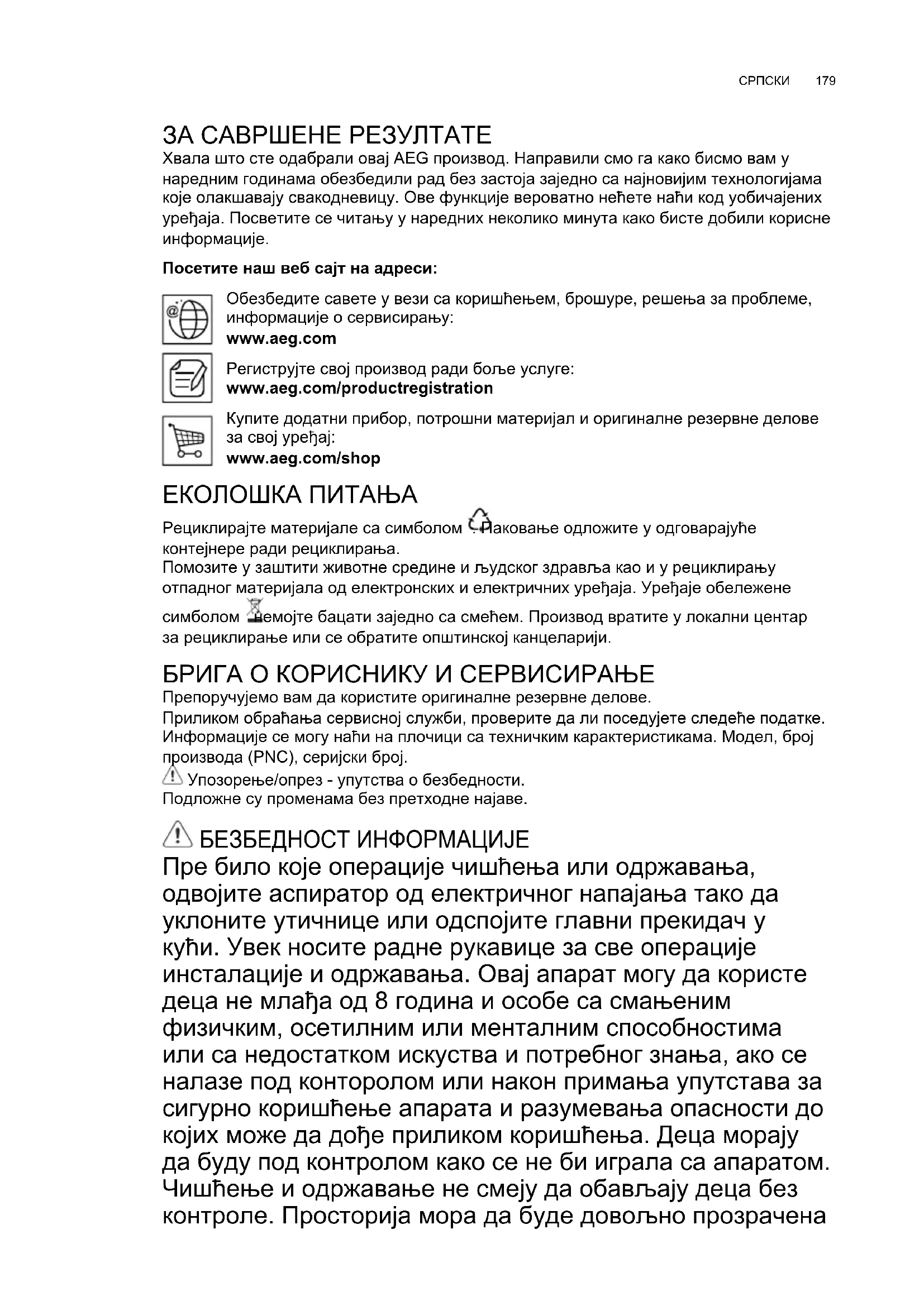 ЗА САВРШЕНЕ РЕЗУЛТАТЕ Хвала што сте одабрали овај AEG производ. Направили смо га како бисмо вам у наредним годинама обезбедили рад без застоја заједно са најновијим технологијама које олакшавају свакодневицу. Ове функције вероватно нећете наћи код уобичајених уређаја. Посветите се читању у наредних неколико минута како бисте добили корисне информације. Посетите наш веб сајт на адреси: Обезбедите савете у вези са коришћењем, брошуре, решења за проблеме, информације о сервисирању: www.aeg.com Региструјте свој производ ради боље услуге: www.aeg.com/productregistration Купите додатни прибор, потрошни материјал и оригиналне резервне делове за свој уређај: www.aeg.com/shop ЕКОЛОШКА ПИТАЊА Рециклирајте материјале са симболом . Паковање одложите у одговарајуће контејнере ради рециклирања. Помозите у заштити животне средине и људског здравља као и у рециклирању отпадног материјала од електронских и електричних уређаја. Уређаје обележене симболом немојте бацати заједно са смећем. Производ вратите у локални центар за рециклирање или се обратите општинској канцеларији. БРИГА О КОРИСНИКУ И СЕРВИСИРАЊЕ Препоручујемо вам да користите оригиналне резервне делове. Приликом обраћања сервисној служби, проверите да ли поседујете следеће податке. Информације се могу наћи на плочици са техничким карактеристикама. Модел, број производа (PNC), серијски број. Упозорење/опрез - упутства о безбедности. Подложне су променама без претходне најаве. БЕЗБЕДНОСТ ИНФОРМАЦИЈЕ Пре било које операције чишћења или одржавања, одвојите аспиратор од електричног напајања тако да уклоните утичнице или одспојите главни прекидач у кући. Увек носите радне рукавице за све операције инсталације и одржавања. Овај апарат могу да користе деца не млађа од 8 година и особе са смањеним физичким, осетилним или менталним способностима или са недостатком искуства и потребног знања, ако се налазе под конторолом или након примања упутстава за сигурно коришћење апарата и разумевања опасности до којих може да дође приликом коришћења. Деца морају да буду под контролом како се не би играла са апаратом. Чишћење и одржавање не смеју да обављају деца без контроле. Просторија мора да буде довољно прозрачена SR КОРИСНИЧКО УПУТСТВОwww.aeg.com