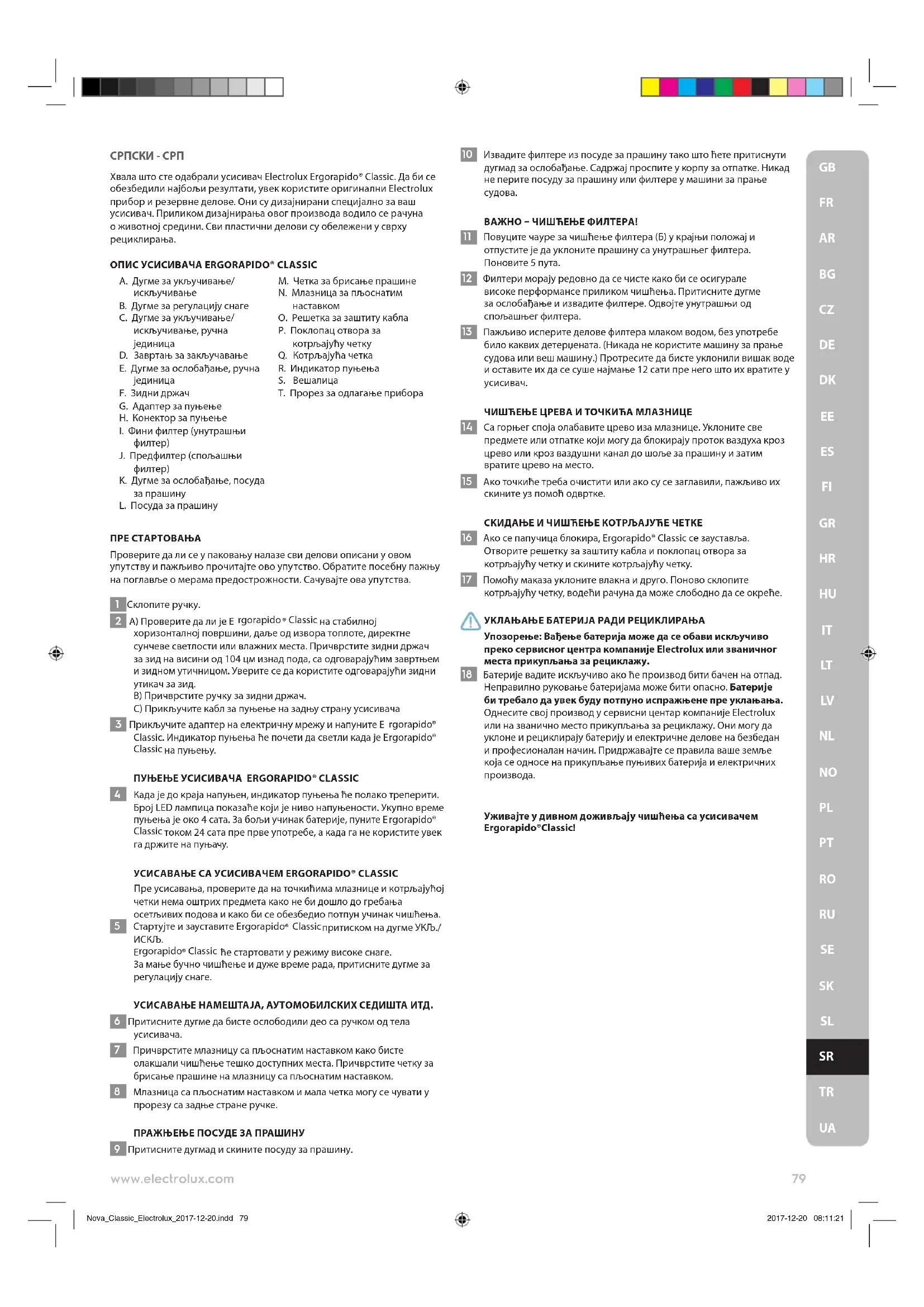 Nova_Classic_Electrolux_2017-12-20.indd 78 2017-12-20 08:11:20СРПСКИ - СРП Хвала што сте одабрали усисивач Electrolux Ergorapido® Classic. Да би се обезбедили најбољи резултати, увек користите оригинални Electrolux прибор и резервне делове. Они су дизајнирани специјално за ваш усисивач. Приликом дизајнирања овог производа водило се рачуна о животној средини. Сви пластични делови су обележени у сврху рециклирања. ОПИС УСИСИВАЧА ERGORAPIDO® CLASSIC A. Дугме за укључивање/ искључивање B. Дугме за регулацију снаге C. Дугме за укључивање/ искључивање, ручна
