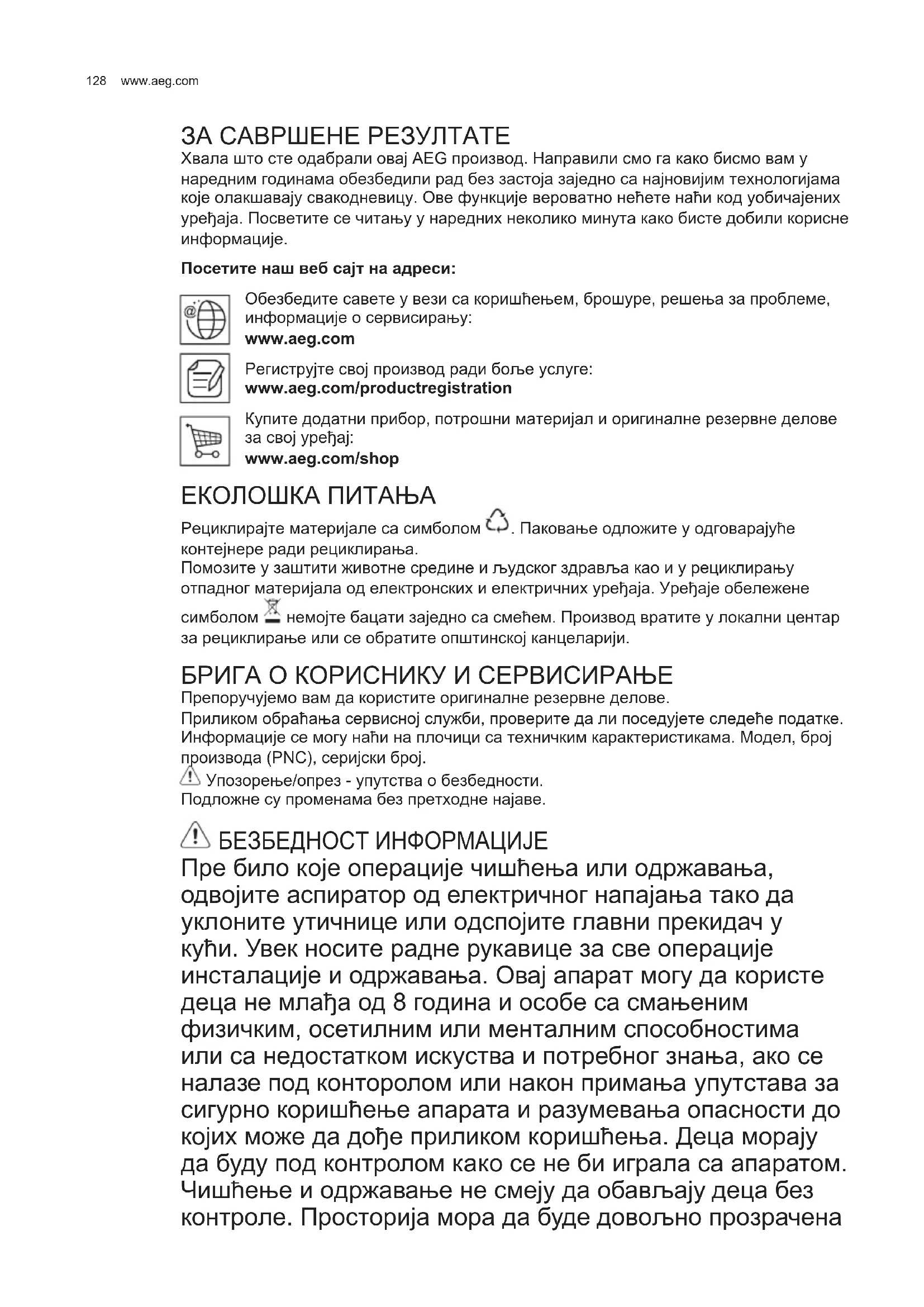 ЗА САВРШЕНЕ РЕЗУЛТАТЕ Хвала што сте одабрали овај AEG производ. Направили смо га како бисмо вам у наредним годинама обезбедили рад без застоја заједно са најновијим технологијама које олакшавају свакодневицу. Ове функције вероватно нећете наћи код уобичајених уређаја. Посветите се читању у наредних неколико минута како бисте добили корисне информације. Посетите наш веб сајт на адреси: Обезбедите савете у вези са коришћењем, брошуре, решења за проблеме, информације о сервисирању: www.aeg.com Региструјте свој производ ради боље услуге: www.aeg.com/productregistration Купите додатни прибор, потрошни материјал и оригиналне резервне делове за свој уређај: www.aeg.com/shop ЕКОЛОШКА ПИТАЊА Рециклирајте материјале са симболом . Паковање одложите у одговарајуће контејнере ради рециклирања. Помозите у заштити животне средине и људског здравља као и у рециклирању отпадног материјала од електронских и електричних уређаја. Уређаје обележене симболом немојте бацати заједно са смећем. Производ вратите у локални центар за рециклирање или се обратите општинској канцеларији. БРИГА О КОРИСНИКУ И СЕРВИСИРАЊЕ Препоручујемо вам да користите оригиналне резервне делове. Приликом обраћања сервисној служби, проверите да ли поседујете следеће податке. Информације се могу наћи на плочици са техничким карактеристикама. Модел, број производа (PNC), серијски број. Упозорење/опрез - упутства о безбедности. Подложне су променама без претходне најаве. БЕЗБЕДНОСТ ИНФОРМАЦИЈЕ Пре било које операције чишћења или одржавања, одвојите аспиратор од електричног напајања тако да уклоните утичнице или одспојите главни прекидач у кући. Увек носите радне рукавице за све операције инсталације и одржавања. Овај апарат могу да користе деца не млађа од 8 година и особе са смањеним физичким, осетилним или менталним способностима или са недостатком искуства и потребног знања, ако се налазе под конторолом или након примања упутстава за сигурно коришћење апарата и разумевања опасности до којих може да дође приликом коришћења. Деца морају да буду под контролом како се не би играла са апаратом. Чишћење и одржавање не смеју да обављају