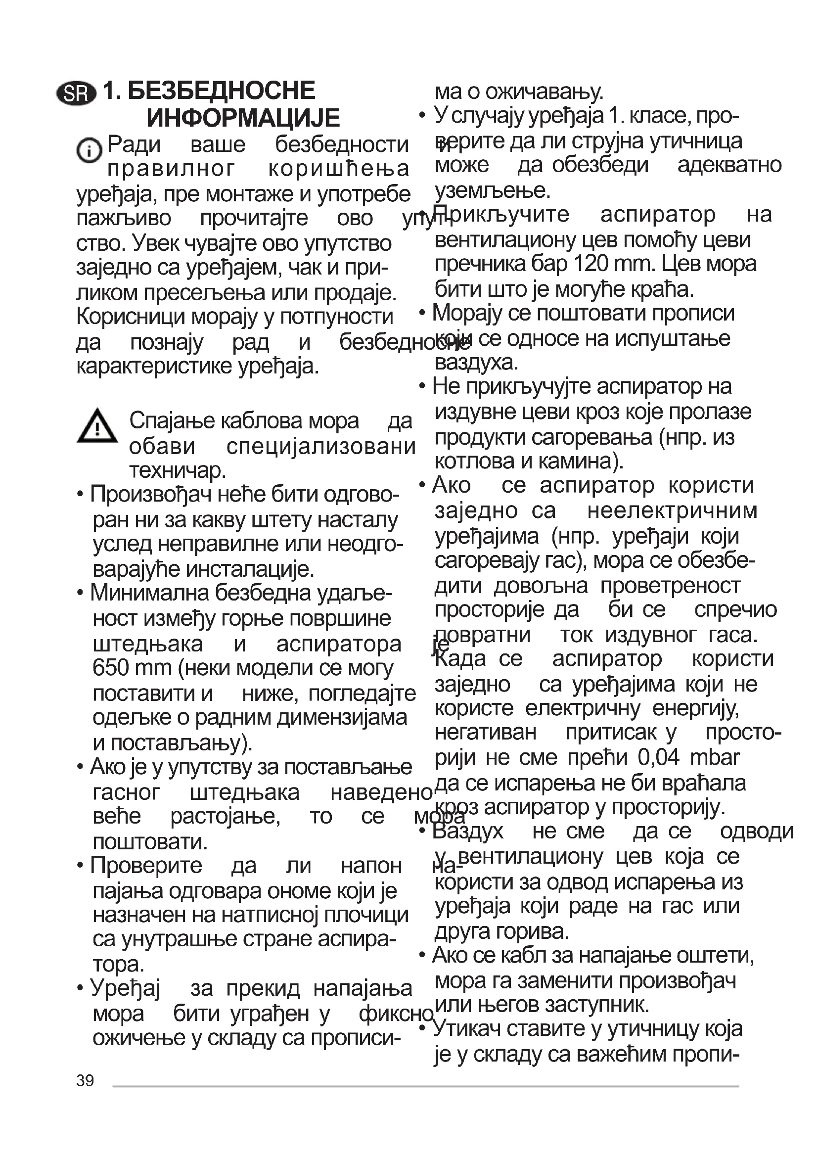- Ако се аспиратор користи заједно са неелектричним уређајима (нпр. уређаји који сагоревајугас),морасеобезбе- дити довољна проветреност просторије да би се спречио повратни ток издувног гаса. Када се аспиратор користи заједно са уређајима који не користе електричну енергију, негативан притисак у просто- рији не сме прећи 0,04 mbar дасеиспарењанебивраћала крозаспираторупросторију.