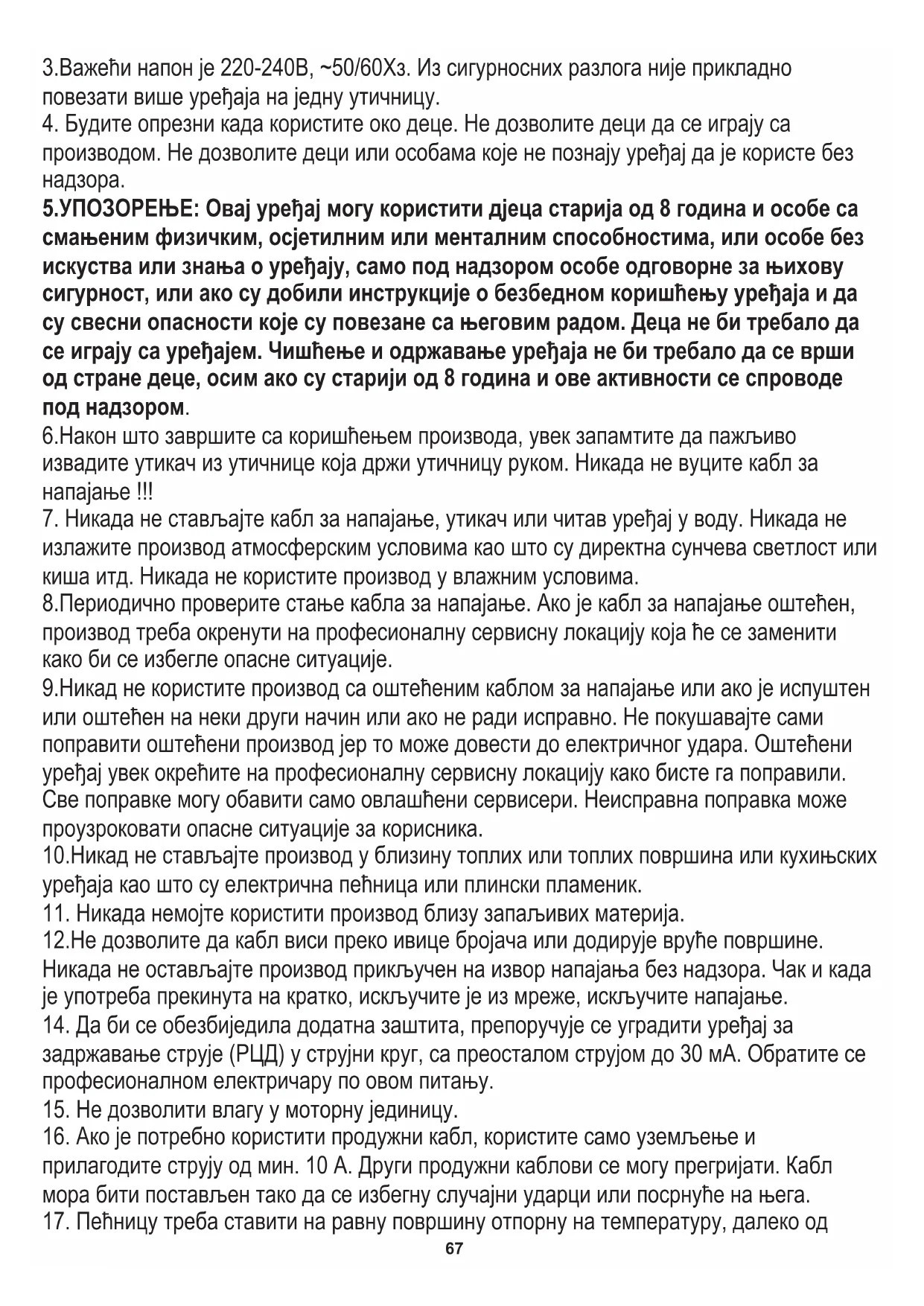 прилагодите струју од мин. 10 А. Други продужни каблови се могу прегријати. Кабл мора бити постављен тако да се избегну случајни ударци или посрнуће на њега. 8.Периодично проверите стање кабла за напајање. Ако је кабл за напајање оштећен, производ треба окренути на професионалну сервисну локацију која ће се заменити како би се избегле опасне ситуације. 9.Никад не користите производ са оштећеним каблом за напајање или ако је испуштен или оштећен на неки други начин или ако не ради исправно. Не покушавајте сами поправити оштећени производ јер то може довести до електричног удара. Оштећени уређај увек окрећите на професионалну сервисну локацију како бисте га поправили. Све поправке могу обавити само овлашћени сервисери. Неисправна поправка може проузроковати опасне ситуације за корисника. 6727. Очистите уређај након сваке употребе.