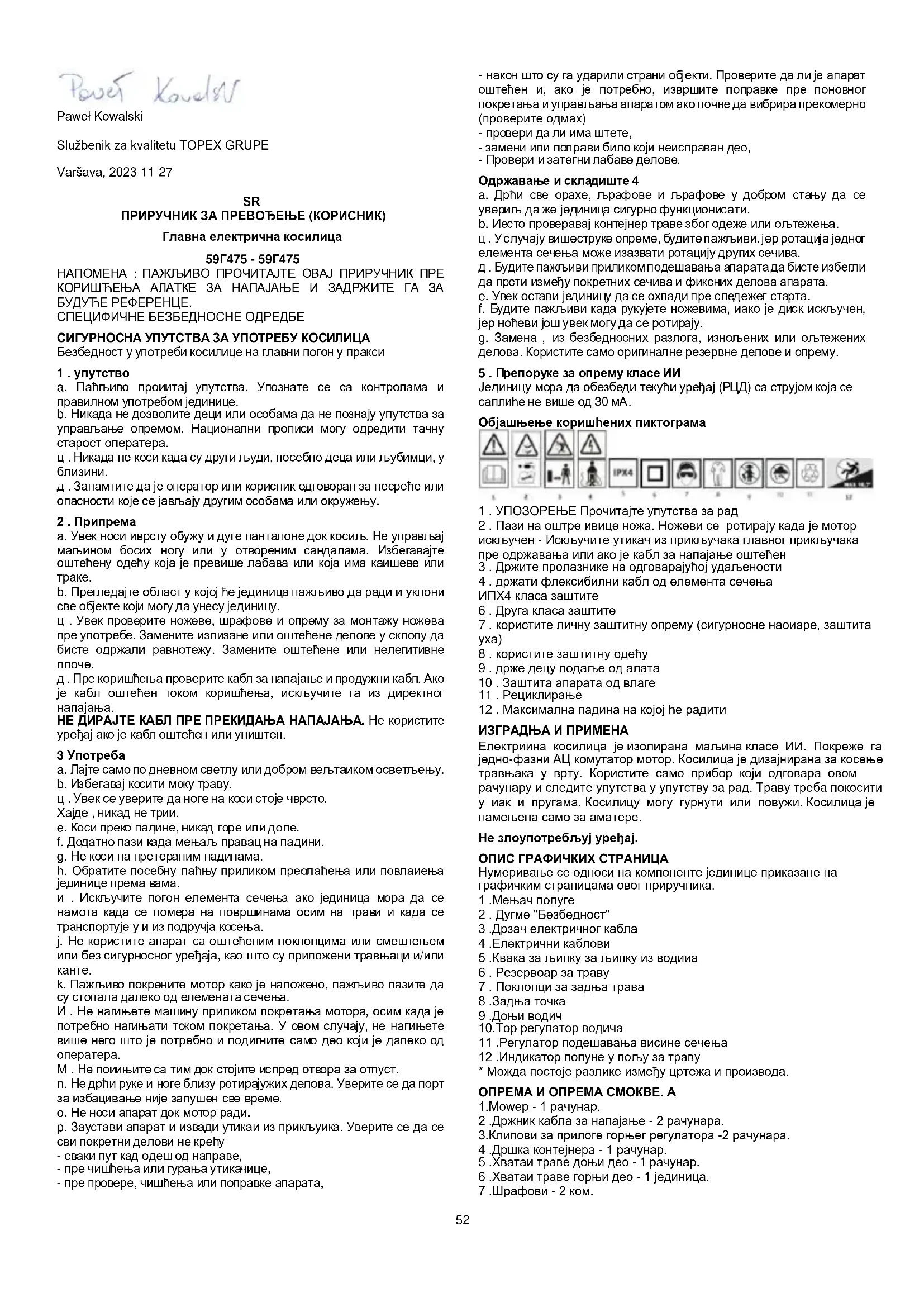 ПРИРУЧНИК ЗА ПРЕВОЂЕЊЕ (КОРИСНИК) Главна електрична косилица 59Г475 - 59Г475 НАПОМЕНА : ПАЖЉИВО ПРОЧИТАЈТЕ ОВАЈ ПРИРУЧНИК ПРЕ КОРИШЋЕЊА АЛАТКЕ ЗА НАПАЈАЊЕ И ЗАДРЖИТЕ ГА ЗА БУДУЋЕ РЕФЕРЕНЦЕ. СПЕЦИФИЧНЕ БЕЗБЕДНОСНЕ ОДРЕДБЕ СИГУРНОСНА УПУТСТВА ЗА УПОТРЕБУ КОСИЛИЦА Безбедност у употреби косилице на главни погон у пракси 1 . упутство a. Паћљиво проиитај упутства. Упознате се са контролама и правилном употребом јединице. b. Никада не дозволите деци или особама да не познају упутства за управљање опремом. Национални прописи могу одредити тачну старост оператера. ц . Никада не коси када су други људи, посебно деца или љубимци, у