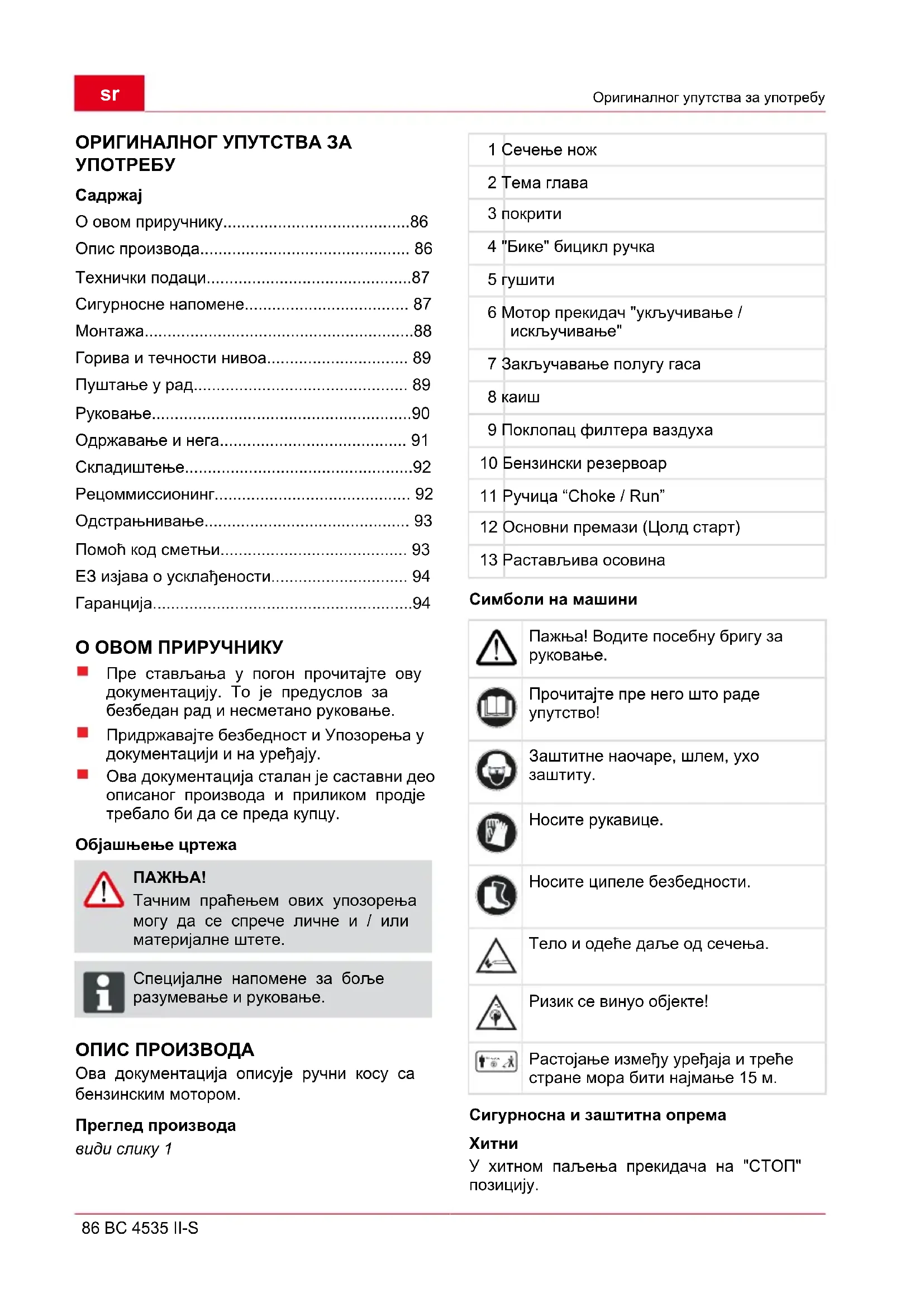 Тачним праћењем ових упозорења могу да се спрече личне и / или материјалне штете. ADVICE Специјалне напомене за боље разумевање и руковање. ОПИС ПРОИЗВОДА Ова документација описује ручни косу са бензинским мотором. Преглед производа види слику 1 1 Сечење нож 2 Тема глава 3 покрити 4 "Бике" бицикл ручка 5 гушити 6 Мотор прекидач "укључивање / искључивање" 7 Закључавање полугу гаса 8 каиш 9 Поклопац филтера ваздуха 10 Бензински резервоар 11 Ручица “Choke / Run” 12 Основни премази (Цолд старт) 13 Растављива осовина Симболи на машини Пажња! Водите посебну бригу за