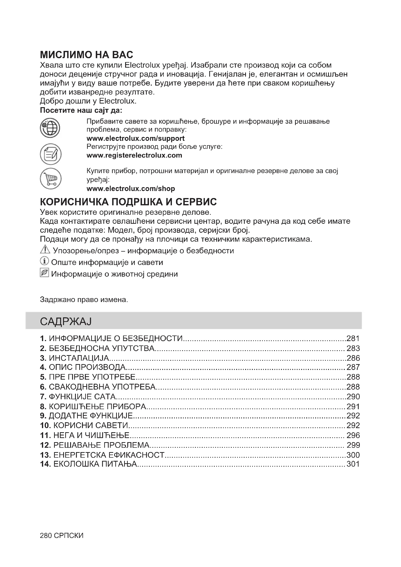 www.electrolux.com/shop КОРИСНИЧКА ПОДРШКА И СЕРВИС Увек користите оригиналне резервне делове. Када контактирате овлашћени сервисни центар, водите рачуна да код себе имате следеће податке: Модел, број производа, серијски број. Подаци могу да се пронађу на плочици са техничким карактеристикама. Упозорење/опрез – информације о безбедности Опште информације и савети Информације о животној средини Задржано право измена.