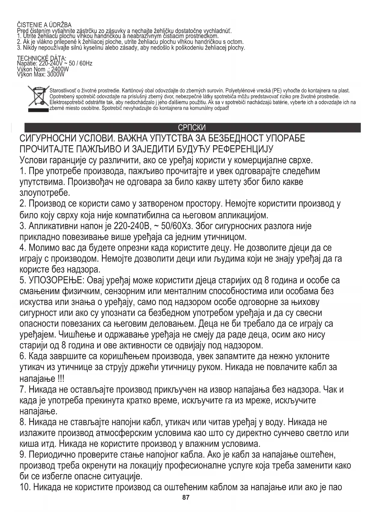 ТЕХНИЧКИ ПОДАЦИ: Напон: 220-240В ~ 50 / 60Хз Повер Ном .: 2400В Снага Мак: 3000В За заштиту животне средине: молимо вас да одвојите картонске кутије и пластичне кесе и одложите их у одговарајуће канте за смеће. Коришћени уређај треба да буде испоручен на наменске сакупљане тачке због оштрих компоненти, што може утицати на животну средину. Немојте одлагати овај уређај у заједничку корпу за отпатке.