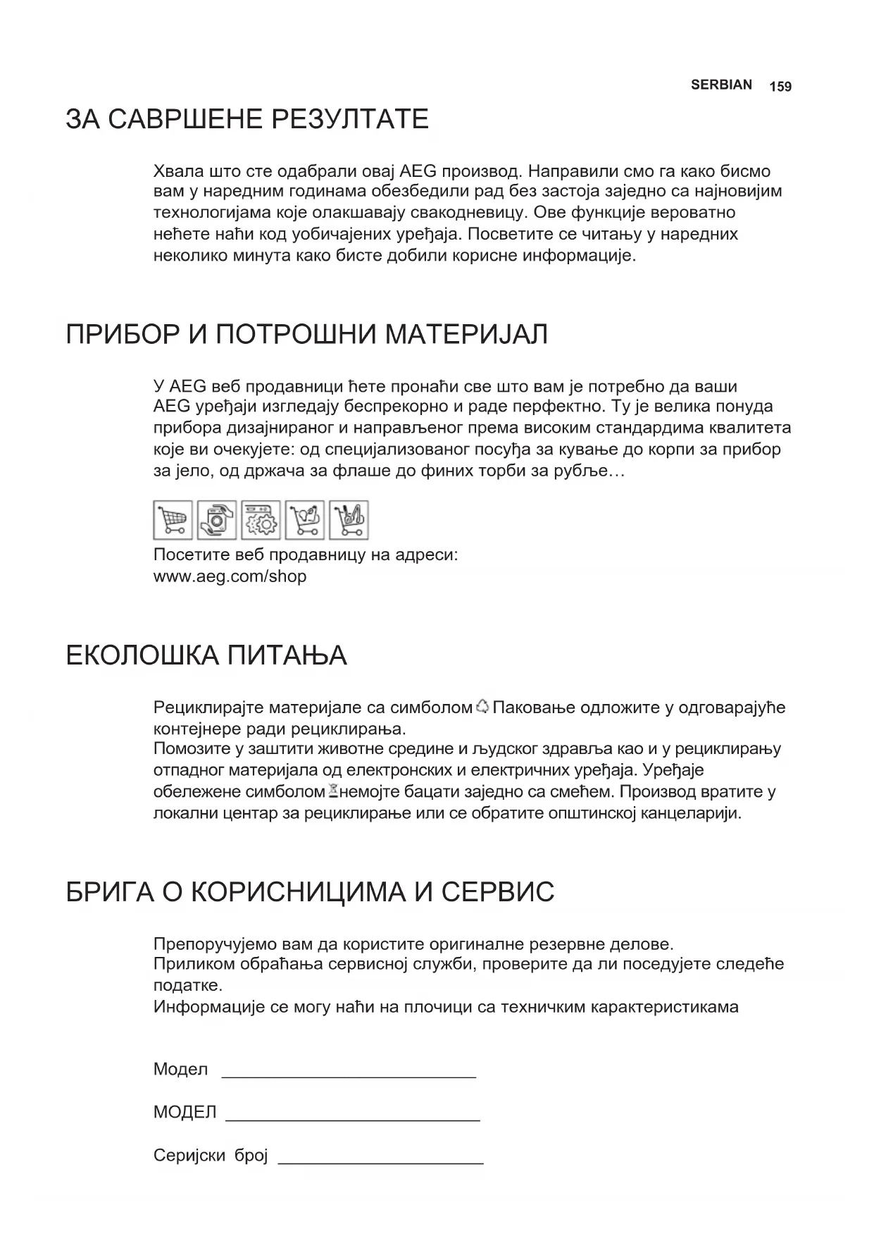 - Për zëvendësimin kontaktoni Asistencën Teknike ("Për ta blerë drejtohuni asistencës teknike").159 SERBIAN ЗА САВРШЕНЕ РЕЗУЛТАТЕ Хвала што сте одабрали овај AEG производ. Направили смо га како бисмо вам у наредним годинама обезбедили рад без застоја заједно са најновијим технологијама које олакшавају свакодневицу. Ове функције вероватно нећете наћи код уобичајених уређаја. Посветите се читању у наредних неколико минута како бисте добили корисне информације. ПРИБОР И ПОТРОШНИ МАТЕРИЈАЛ У AEG веб продавници ћете пронаћи све што вам је потребно да ваши AEG уређаји изгледају беспрекорно и раде перфектно. Ту је велика понуда прибора дизајнираног и направљеног према високим стандардима квалитета које ви очекујете: од специјализованог посуђа за кување до корпи за прибор за јело, од држача за флаше до финих торби за рубље… Посетите веб продавницу на адреси: www.aeg.com/shop ЕКОЛОШКА ПИТАЊА Рециклирајте материјале са симболом . Паковање одложите у одговарајуће контејнере ради рециклирања. Помозите у заштити животне средине и људског здравља као и у рециклирању отпадног материјала од електронских и електричних уређаја. Уређаје обележене симболом немојте бацати заједно са смећем. Производ вратите у локални центар за рециклирање или се обратите општинској канцеларији. БРИГА О КОРИСНИЦИМА И СЕРВИС Препоручујемо вам да користите оригиналне резервне делове. Приликом обраћања сервисној служби, проверите да ли поседујете следеће