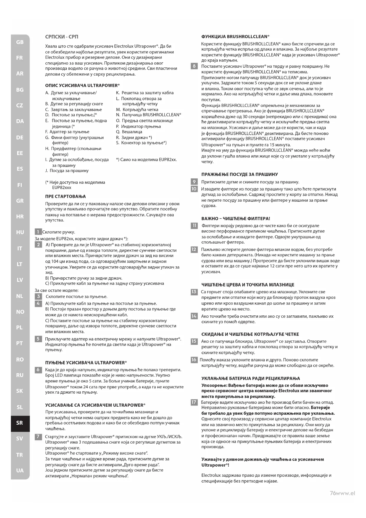J. Посуда за прашину (* Није доступна на моделима EUP82xxx K. Решетка за заштиту кабла L. Поклопац отвора за котрљајућу четку M. Котрљајућа четка N. Папучица BRUSHROLLCLEAN® O. Предња светла млазнице P. Индикатор пуњења Q. Вешалица R. Зидни држач *) S. Конектор за пуњење*) *) Само на моделима EUP82xx. ПРЕ СТАРТОВАЊА Проверите да ли се у паковању налазе сви делови описани у овом упутству и пажљиво прочитаjте ово упутство. Обратите посебну пажњу на поглавље о мерама предострожности. Сачувајте ова