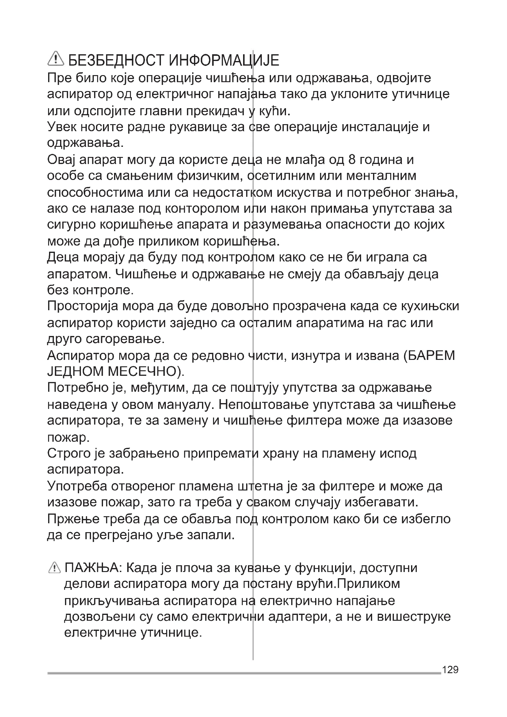 Овајапаратмогудакористедецанемлађаод8годинаи особесасмањенимфизичким,осетилнимилименталним способностимаилисанедостаткомискустваипотребногзнања, акосеналазеподконтороломилинаконпримањаупутставаза сигурнокоришћењеапаратаиразумевањаопасностидокојих можедадођеприликомкоришћења. Децаморајудабудуподконтроломкакосенебииграласа апаратом.Чишћењеиодржавањенесмејудаобављајудеца безконтроле. Просторијаморадабудедовољнопрозраченакадасекухињски аспираторкористизаједносаосталимапаратиманагасили другосагоревање. Аспираторморадасередовночисти,изнутраиизвана(БАРЕМ ЈЕДНОММЕСЕЧНО). Потребноје,међутим,дасепоштујуупутствазаодржавање наведенауовоммануалу.Непоштовањеупутставазачишћење аспиратора,тезазаменуичишћењефилтераможедаизазове