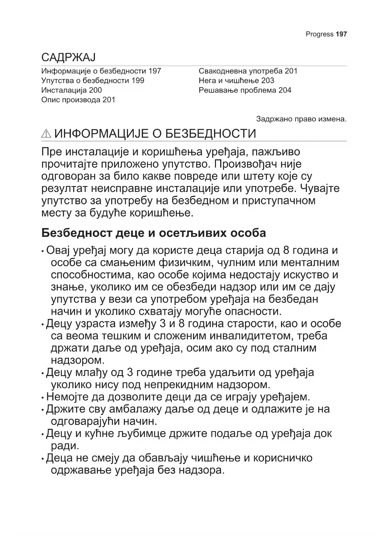 - Деца не смеју да обављају чишћење и корисничко одржавање уређаја без надзора. Progress 197Опште мере безбедности