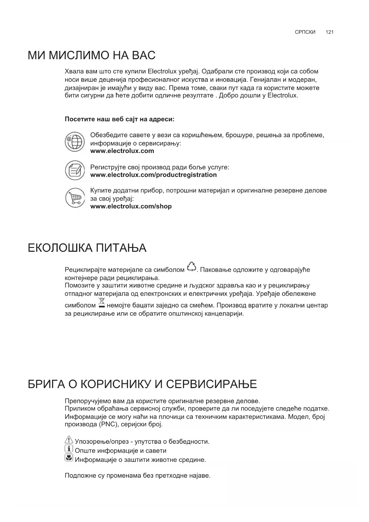 Обезбедите савете у вези са коришћењем, брошуре, решења за проблеме, информације о сервисирању: www.electrolux.com Региструјте свој производ ради боље услуге: www.electrolux.com/productregistration Купите додатни прибор, потрошни материјал и оригиналне резервне делове за свој уређај: www.electrolux.com/shop ЕКОЛОШКА ПИТАЊА Рециклирајте материјале са симболом . Паковање одложите у одговарајуће контејнере ради рециклирања. Помозите у заштити животне средине и људског здравља као и у рециклирању отпадног материјала од електронских и електричних уређаја. Уређаје обележене симболом немојте бацати заједно са смећем. Производ вратите у локални центар за рециклирање или се обратите општинској канцеларији. БРИГА О КОРИСНИКУ И СЕРВИСИРАЊЕ Препоручујемо вам да користите оригиналне резервне делове. Приликом обраћања сервисној служби, проверите да ли поседујете следеће податке. Информације се могу наћи на плочици са техничким карактеристикама. Модел, број производа (PNC), серијски број. Упозорење/опрез - упутства о безбедности. Опште информације и савети Информације о заштити животне средине. Подложне су променама без претходне најаве.
