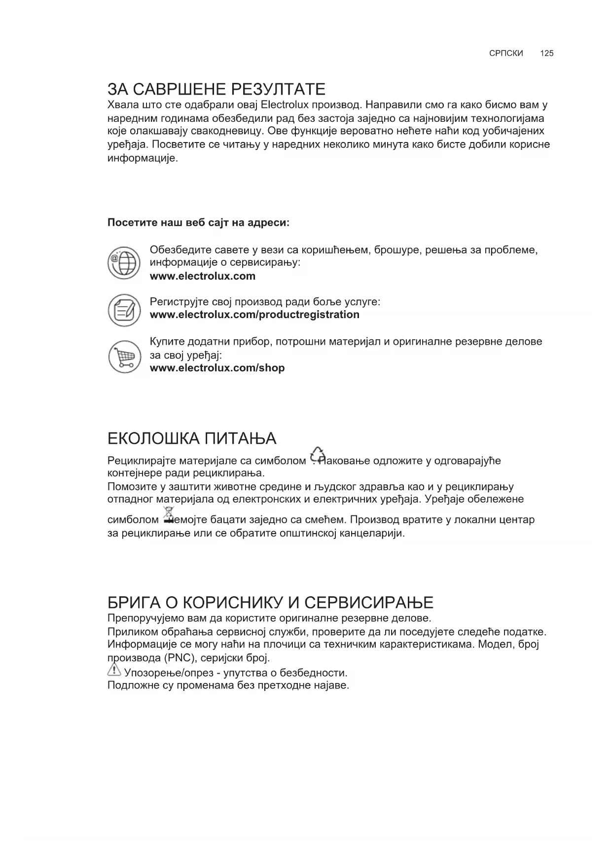 ЗА САВРШЕНЕ РЕЗУЛТАТЕ Хвала што сте одабрали овај Electrolux производ. Направили смо га како бисмо вам у наредним годинама обезбедили рад без застоја заједно са најновијим технологијама које олакшавају свакодневицу. Ове функције вероватно нећете наћи код уобичајених уређаја. Посветите се читању у наредних неколико минута како бисте добили корисне информације. Посетите наш веб сајт на адреси: Обезбедите савете у вези са коришћењем, брошуре, решења за проблеме, информације о сервисирању: www.electrolux.com Региструјте свој производ ради боље услуге: www.electrolux.com/productregistration Купите додатни прибор, потрошни материјал и оригиналне резервне делове за свој уређај: www.electrolux.com/shop ЕКОЛОШКА ПИТАЊА Рециклирајте материјале са симболом . Паковање одложите у одговарајуће контејнере ради рециклирања. Помозите у заштити животне средине и људског здравља као и у рециклирању отпадног материјала од електронских и електричних уређаја. Уређаје обележене симболом немојте бацати заједно са смећем. Производ вратите у локални центар за рециклирање или се обратите општинској канцеларији. БРИГА О КОРИСНИКУ И СЕРВИСИРАЊЕ Препоручујемо вам да користите оригиналне резервне делове. Приликом обраћања сервисној служби, проверите да ли поседујете следеће податке. Информације се могу наћи на плочици са техничким карактеристикама. Модел, број производа (PNC), серијски број. Упозорење/опрез - упутства о безбедности. Подложне су променама без претходне најаве. SR КОРИСНИЧКО УПУТСТВОwww.electrolux.com