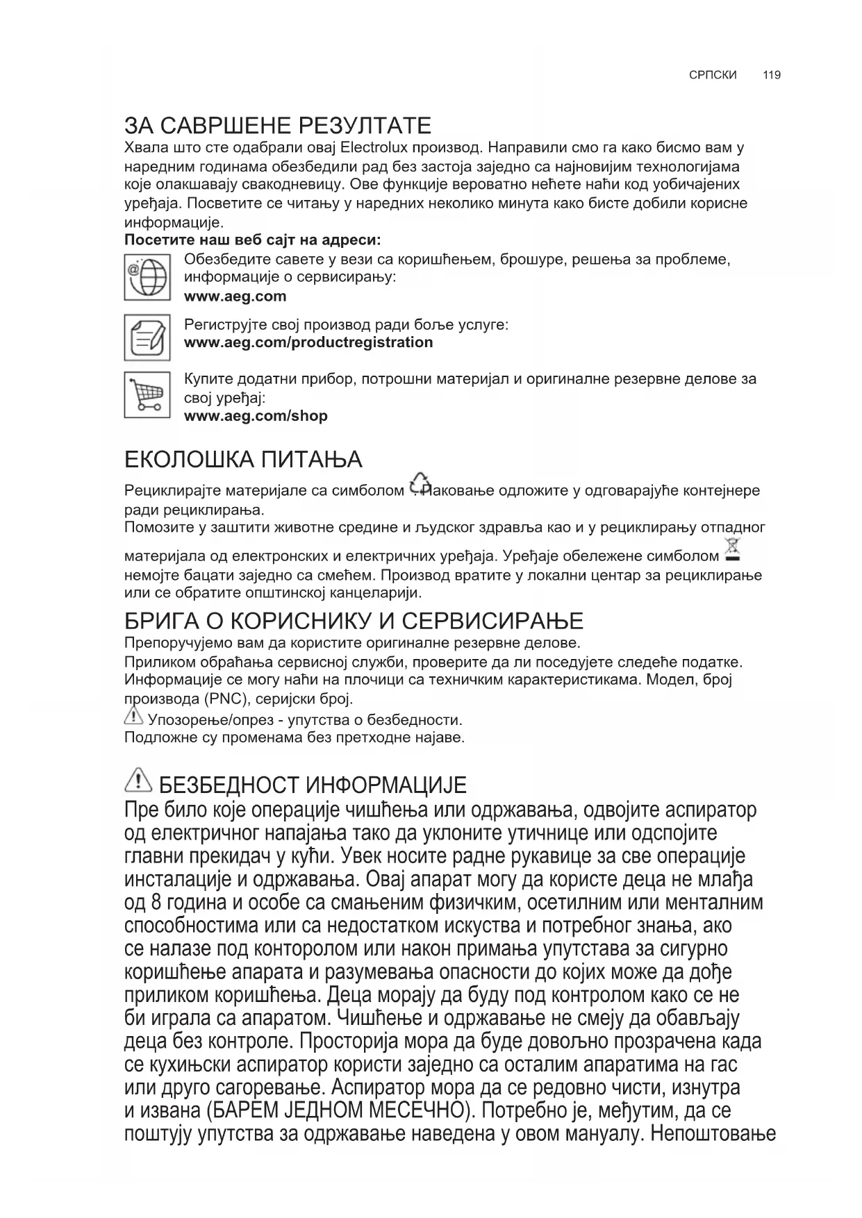 ЗА САВРШЕНЕ РЕЗУЛТАТЕ Хвала што сте одабрали овај Electrolux производ. Направили смо га како бисмо вам у наредним годинама обезбедили рад без застоја заједно са најновијим технологијама које олакшавају свакодневицу. Ове функције вероватно нећете наћи код уобичајених уређаја. Посветите се читању у наредних неколико минута како бисте добили корисне информације. Посетите наш веб сајт на адреси: Обезбедите савете у вези са коришћењем, брошуре, решења за проблеме, информације о сервисирању: www.aeg.com Региструјте свој производ ради боље услуге: www.aeg.com/productregistration Купите додатни прибор, потрошни материјал и оригиналне резервне делове за свој уређај: www.aeg.com/shop ЕКОЛОШКА ПИТАЊА Рециклирајте материјале са симболом . Паковање одложите у одговарајуће контејнере ради рециклирања. Помозите у заштити животне средине и људског здравља као и у рециклирању отпадног материјала од електронских и електричних уређаја. Уређаје обележене симболом немојте бацати заједно са смећем. Производ вратите у локални центар за рециклирање или се обратите општинској канцеларији. БРИГА О КОРИСНИКУ И СЕРВИСИРАЊЕ Препоручујемо вам да користите оригиналне резервне делове. Приликом обраћања сервисној служби, проверите да ли поседујете следеће податке. Информације се могу наћи на плочици са техничким карактеристикама. Модел, број производа (PNC), серијски број. Упозорење/опрез - упутства о безбедности. Подложне су променама без претходне најаве. БЕЗБЕДНОСТ ИНФОРМАЦИЈЕ Пре било које операције чишћења или одржавања, одвојите аспиратор од електричног напајања тако да уклоните утичнице или одспојите главни прекидач у кући. Увек носите радне рукавице за све операције инсталације и одржавања. Овај апарат могу да користе деца не млађа од 8 година и особе са смањеним физичким, осетилним или менталним способностима или са недостатком искуства и потребног знања, ако се налазе под конторолом или након примања упутстава за сигурно коришћење апарата и разумевања опасности до којих може да дође приликом коришћења. Деца морају да буду под контролом како се не би играла са апаратом. Чишћење и одржавање не смеју да обављају деца без контроле. Просторија мора да буде довољно прозрачена када се кухињски аспиратор користи заједно са осталим апаратима на гас или друго сагоревање. Аспиратор мора да се редовно чисти, изнутра и извана (БАРЕМ ЈЕДНОМ МЕСЕЧНО). Потребно је, међутим, да се поштују упутства за одржавање наведена у овом мануалу. Непоштовање SR КОРИСНИЧКО УПУТСТВОwww.aeg.com