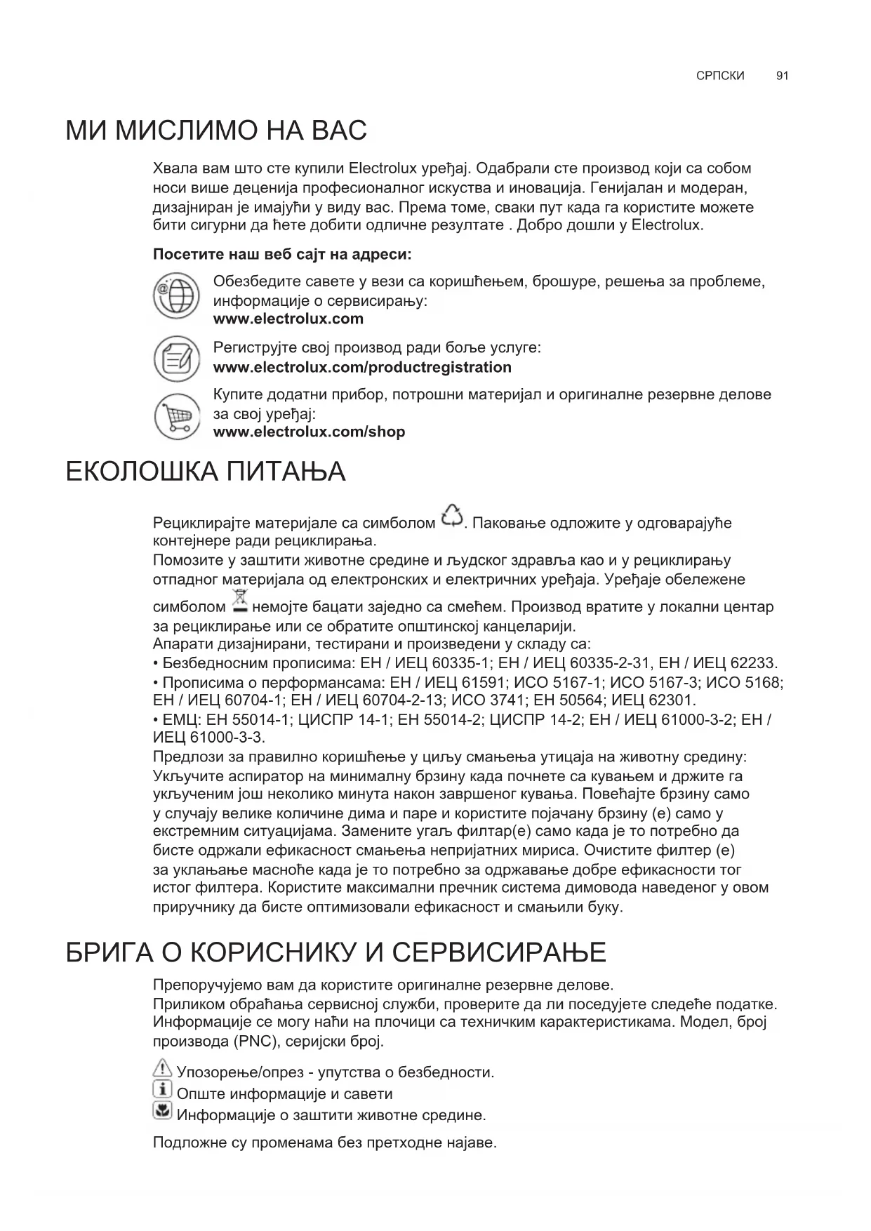 МИ МИСЛИМО НА ВАС Хвала вам што сте купили Electrolux уређај. Одабрали сте производ који са собом носи више деценија професионалног искуства и иновација. Генијалан и модеран, дизајниран је имајући у виду вас. Према томе, сваки пут када га користите можете бити сигурни да ћете добити одличне резултате . Добро дошли у Electrolux. Посетите наш веб сајт на