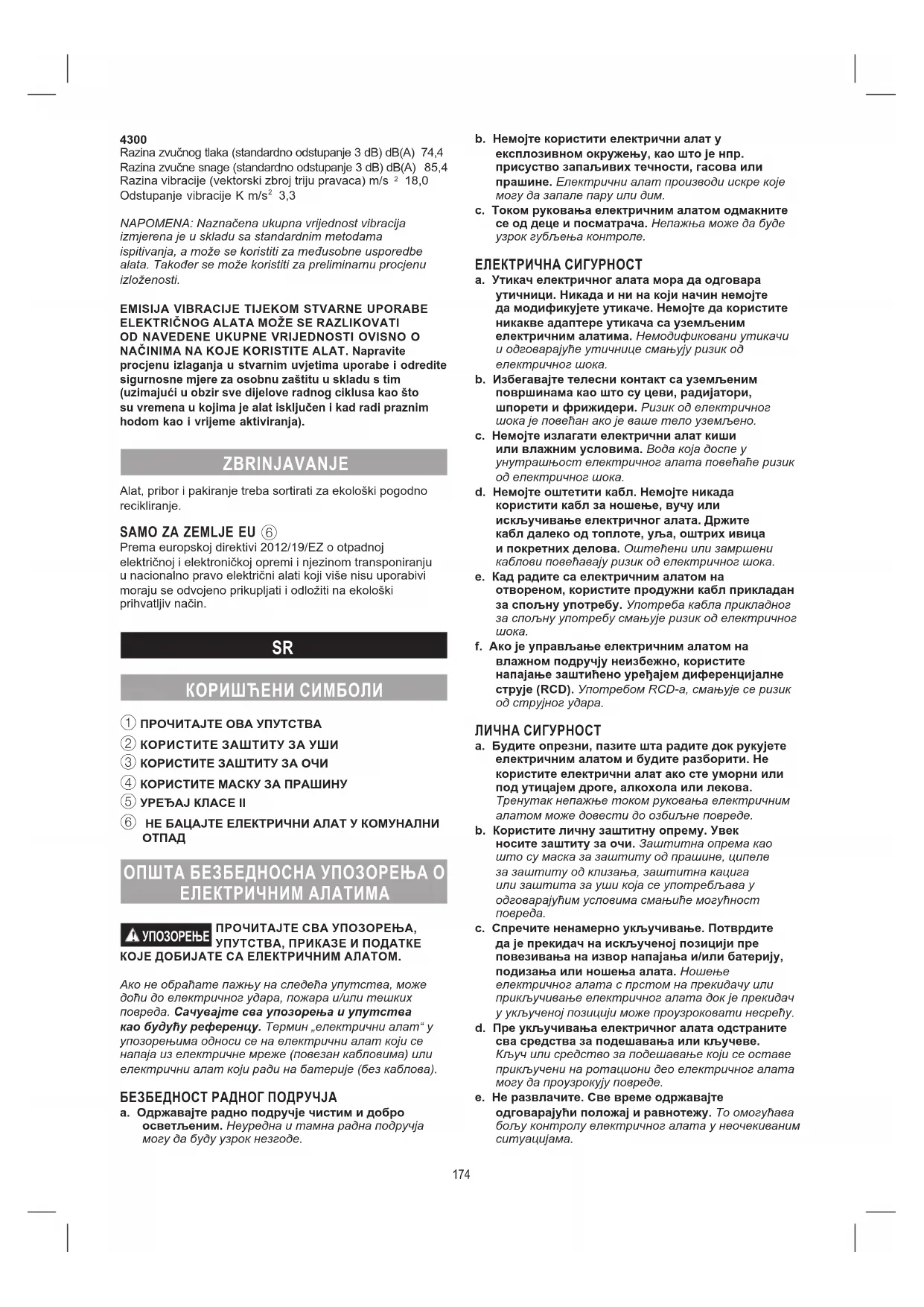 Ниво звучног притиска (стандардно одступање 3dB) dB(A) 74,4Ниво снаге звука (стандардно одступање 3dB) dB(A) 85,4 Вибрација (троосни векторски збир) м/с 18,0Неизвесност вибрације K м/с 3,3НАПОМЕНА: Наведена укупна вредност вибрације је добијена мерењем које је извршено у складу са стандардним методом тестирања и може да се користи за поређење једног алата са другим. Такође може да се користи у прелиминарним проценама изложености.ЕМИСИЈА ВИБРАЦИЈЕ ЗА ВРЕМЕ СТВАРНЕ УПОТРЕБЕ ЕЛЕКТРИЧНОГ АЛАТА МОЖЕ ДА СЕ РАЗЛИКУЈЕ ОД НАВЕДЕНЕ УКУПНЕ ВРЕДНОСТИ ЗАВИСНО ОД НАЧИНА НА КОЈИ КОРИСТИТЕ АЛАТ. Направите процену излагања у стварним условима употребе и идентификујте сигурносне мере за личну заштиту у складу са тим (узимање у обзир свих делова радног циклуса као што су времена у којима је алат искључен и када ради празним ходом додатно уз време активирања). Алат, прибор и амбалажу требало би сортирати за еколошки повољну рециклажу. САМО ЗА ЗЕМЉЕ ЕУ
