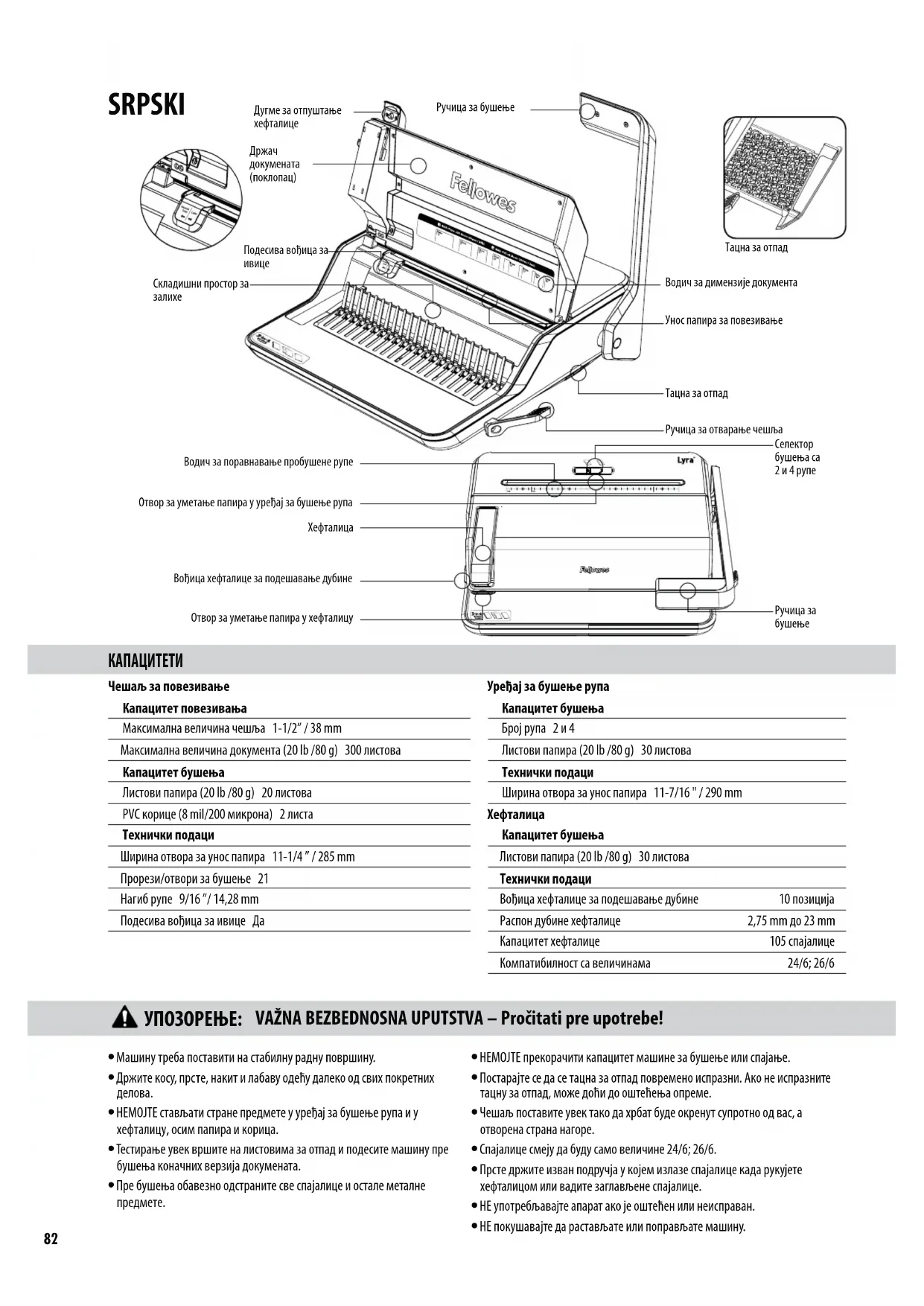 t НЕМОЈТЕ прекорачити капацитет машине за бушење или спајање. t Постарајте се да се тацна за отпад повремено испразни. Ако не испразните тацну за отпад, може доћи до оштећења опреме. t Чешаљ поставите увек тако да хрбат буде окренут супротно од вас, а отворена страна нагоре. t Спајалице смеју да буду само величине 24/6; 26/6. t Прсте држите изван подручја у којем излазе спајалице када рукујете хефталицом или вадите заглављене спајалице. t НЕ употребљавајте апарат ако је оштећен или неисправан. t НЕ покушавајте да растављате или поправљате машину. VAŽNA BEZBEDNOSNA UPUTSTVA – Pročitati pre upotrebe!83 PREČNIK SPIRALE I VELIČINE DOKUMENTA