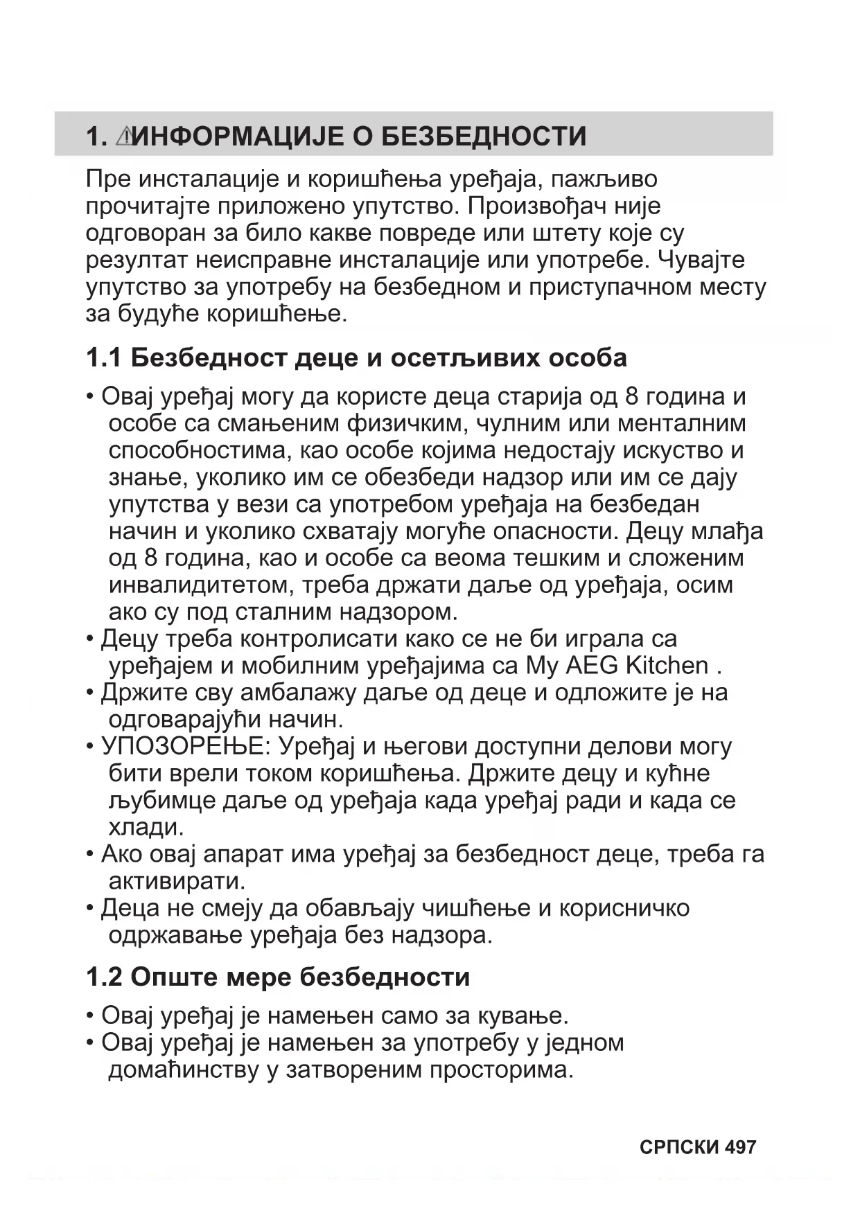 СРПСКИ 495My AEG Kitchen app 496 СРПСКИ1. ИНФОРМАЦИЈЕ О БЕЗБЕДНОСТИ Пре инсталације и коришћења уређаја, пажљиво прочитајте приложено упутство. Произвођач није одговоран за било какве повреде или штету које су резултат неисправне инсталације или употребе. Чувајте упутство за употребу на безбедном и приступачном месту за будуће коришћење.