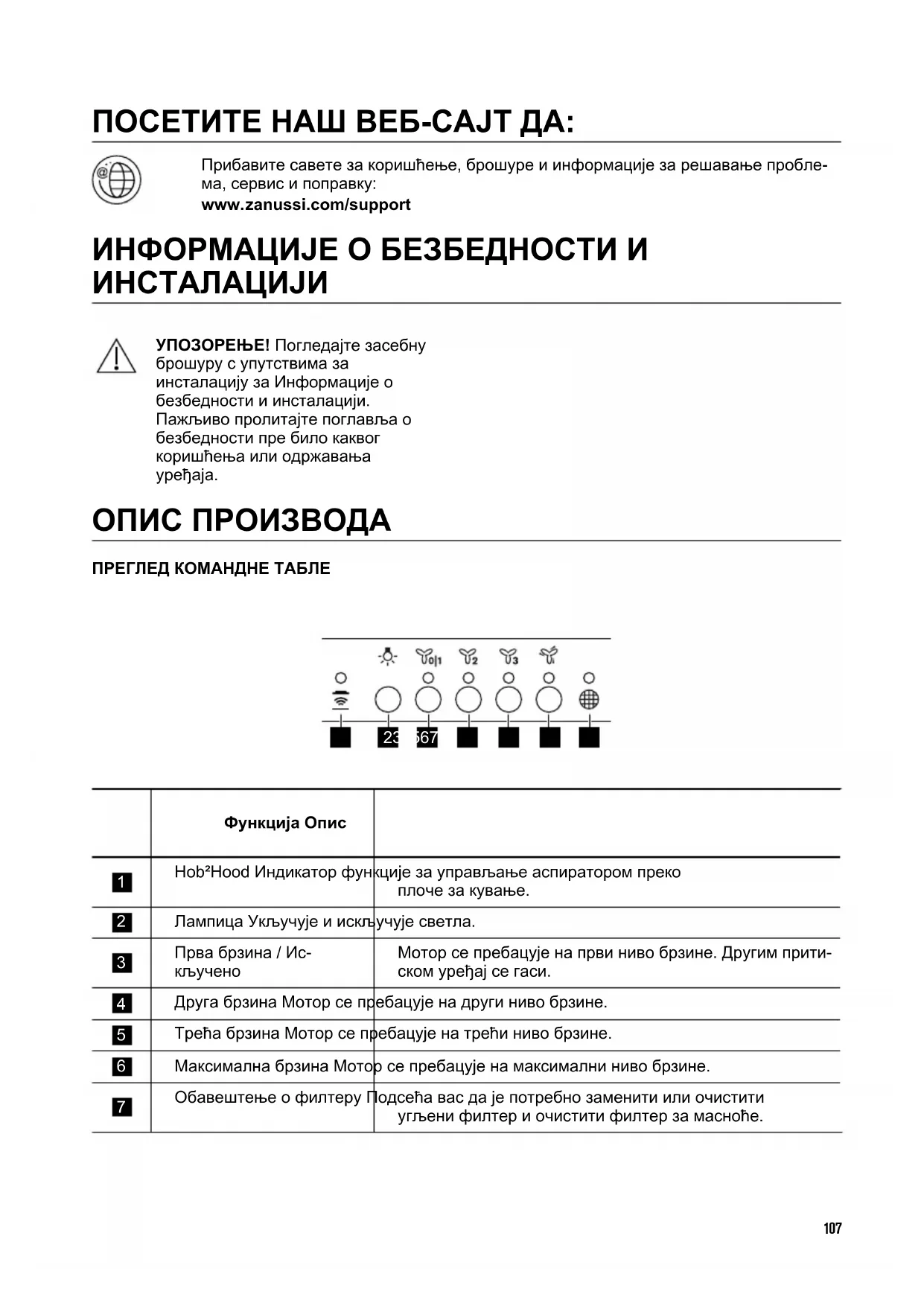 поновите исте кораке обрнутим редоследом. У сваком случају, филтере је потребно мењати барем на свака четири месеца. ЗАМЕНА ЛАМПИЦЕ Уређај се испоручује са LED лампицом. Овај део може да замени само техничар. У случају било каквог квара, погледајте део „Сервис“ у одељку „Упутства о безбедности“. ЕКОЛОШКА ПИТАЊА Рециклирајте материјале са симболом . Паковање одложите у одговарајуће контејнере ради рециклирања. Помозите у заштити животне средине и људског здравља као и у рециклирању отпадног материјала од електронских и електричних уређаја. Уређаје обележене симболом немојте бацати заједно са смећем. Производ вратите у локални центар за рециклирање или се обратите општинској канцеларији. 110BESÖK VÅR WEBBPLATS FÖR ATT: Få tips om användning, broschyrer, felsökning, service- och reparationsinformation: www.zanussi.com/support