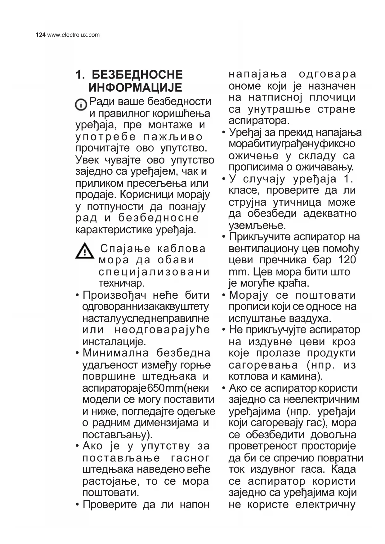 - Ако се аспиратор користи заједно са неелектричним уређајима (нпр. уређаји који сагоревају гас), мора се обезбедити довољна проветреност просторије да би се спречио повратни ток издувног гаса. Када се аспиратор користи заједно са уређајима који не користе електричну125125SERBIAN енергију, негативан притисак у просторији не сме прећи 0,04 mbar да се испарења не би враћала кроз аспиратор у просторију.
