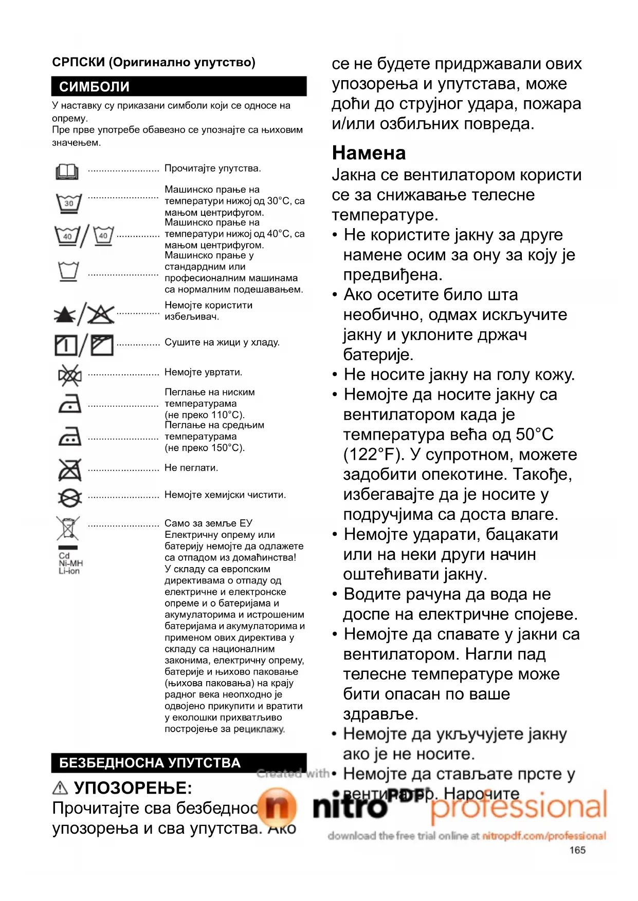 Пеглање на средњим температурама (не преко 150°C). .......................... Не пеглати. .......................... Немојте хемијски чистити. .......................... Само за земље ЕУ Електричну опрему или батерију немојте да одлажете са отпадом из домаћинства! У складу са европским директивама о отпаду од електричне и електронске опреме и о батеријама и акумулаторима и истрошеним батеријама и акумулаторима и применом ових директива у складу са националним законима, електричну опрему, батерије и њихово паковање (њихова паковања) на крају радног века неопходно је одвојено прикупити и вратити у еколошки прихватљиво постројење за рециклажу. БЕЗБЕДНОСНА УПУТСТВА166 поведите рачуна да се деца не играју са јакном.