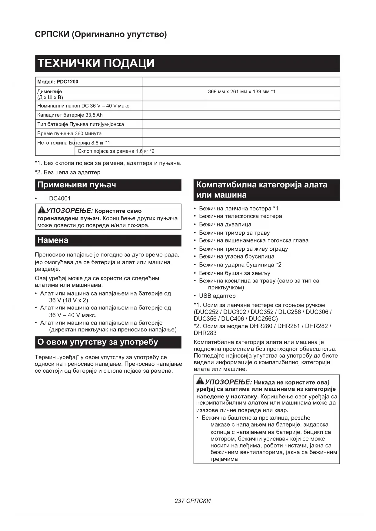 - DC4001 УПОЗОРЕЊЕ: Користите само горенаведени пуњач. Коришћење других пуњача може довести до повреде и/или пожара.