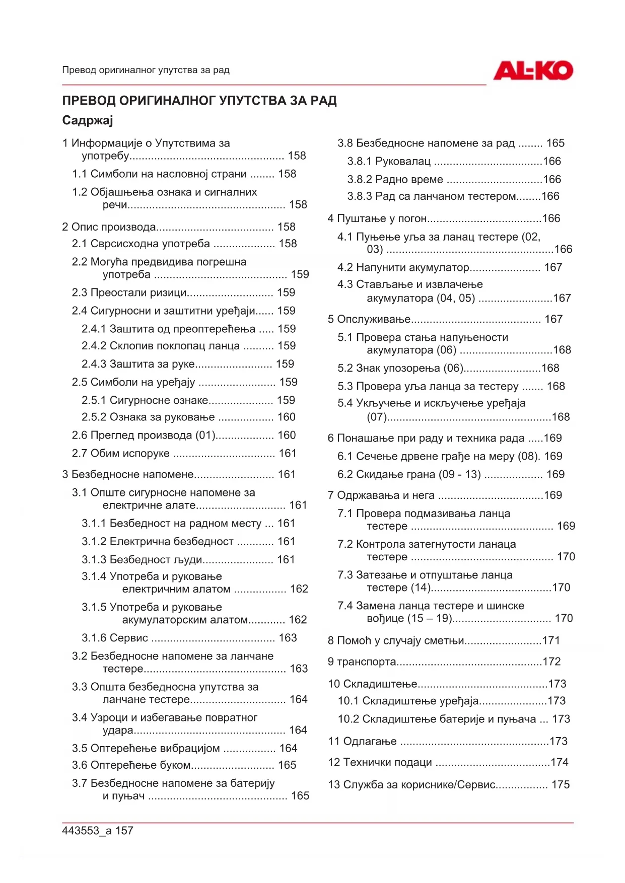 Покушајте да излагање вибрацијама буде што је могуће ниже. Примерне мере за смањење изложености вибрацијама су ношење рукавица приликом употребе алата и ограничавање радног времена. Морају се узети у обзир сви делови радног циклуса (на пример времена када је електрични алат искључен и времена када је алат укључен, али ради без оптерећења). 13 СЛУЖБА ЗА КОРИСНИКЕ/СЕРВИС Код питања у вези са гаранцијом, поправком или резервним деловима се обратите вашем најближем AL-KOсервису. Њега ћете наћи на интернету под следећом адресом: www.alko-garden.com/service-contacts Додатне информације о резервним деловима можете да пронађете на: www.alko-garden.com/spareparts 14 ИНФОРМАЦИЈЕ О ИЗЈАВЕ О УСКЛАЂЕНОСТИ Овим под пуном одговорношћу изјављујемо, да овај производ у облику којим се продаје на тржишту испуњава захтеве хармонизованих ЕУ-директива, безбедносних стандарда ЕУ и стандарда који су специфични за овај производ. Изјава о усклађености је део упутства за употребу и приложена је машини.RS 176 CSM 1815