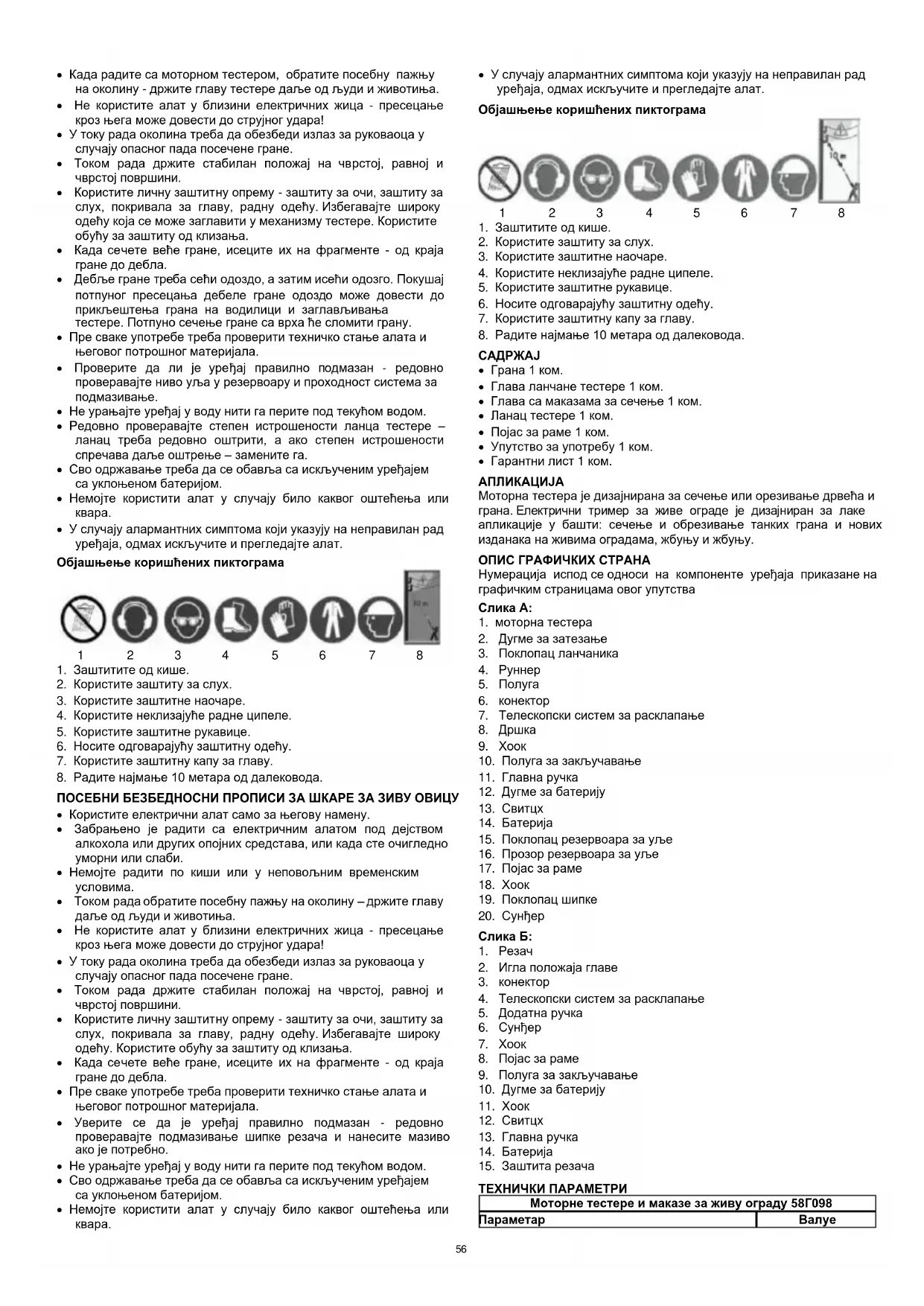 Моторна тестера је дизајнирана за сечење или орезивање дрвећа и грана. Електрични тример за живе ограде је дизајниран за лаке апликације у башти: сечење и обрезивање танких грана и нових изданака на живима оградама, жбуњу и жбуњу. ОПИС ГРАФИЧКИХ СТРАНА Нумерација испод се односи на компоненте уређаја приказане на графичким страницама овог упутства