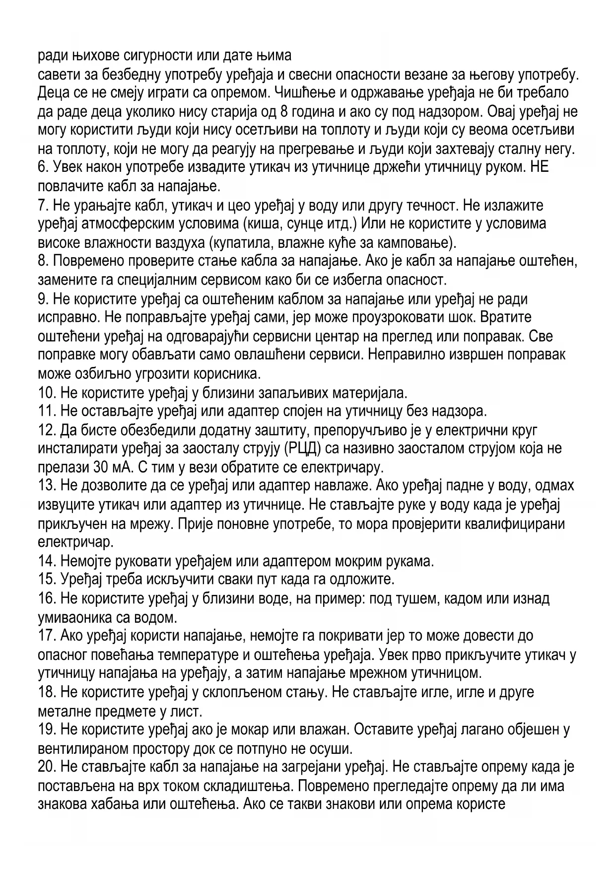 20. Не стављајте кабл за напајање на загрејани уређај. Не стављајте опрему када је