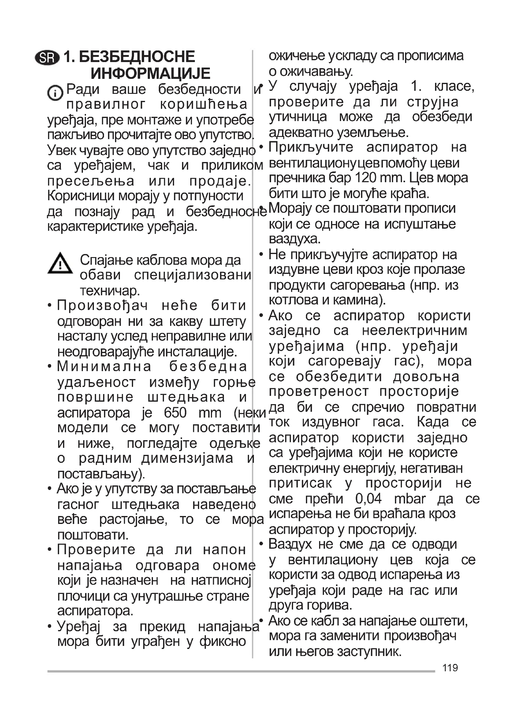 - Ако се аспиратор користи заједно са неелектричним уређајима (нпр. уређаји који сагоревају гас), мора се обезбедити довољна проветреност просторије да би се спречио повратни ток издувног гаса. Када се аспиратор користи заједно са уређајима који не користе електричнуенергију,негативан притисак у просторији не сме прећи 0,04 mbar да се испарењанебивраћалакроз аспираторупросторију.
