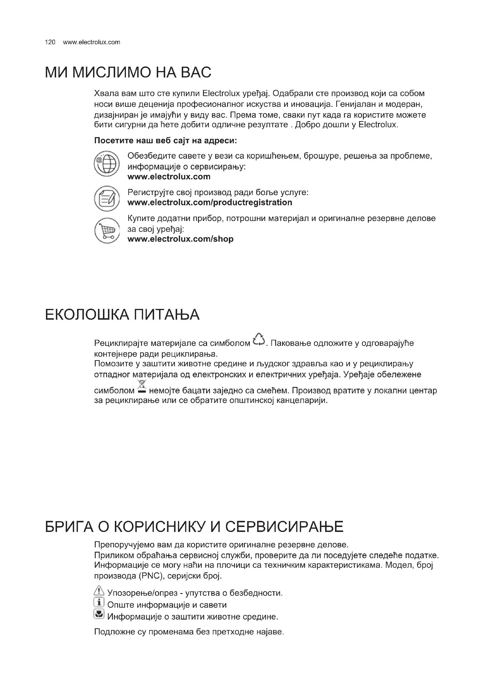 МИ МИСЛИМО НА ВАС Хвала вам што сте купили Electrolux уређај. Одабрали сте производ који са собом носи више деценија професионалног искуства и иновација. Генијалан и модеран, дизајниран је имајући у виду вас. Према томе, сваки пут када га користите можете бити сигурни да ћете добити одличне резултате . Добро дошли у Electrolux. Посетите наш веб сајт на