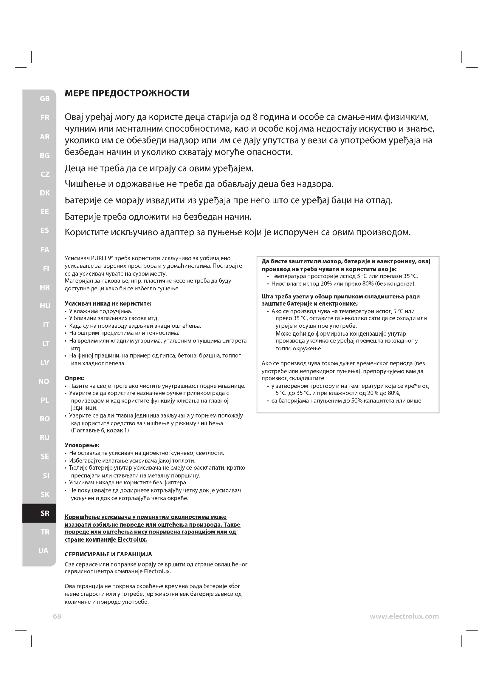 ВРЕМЕ ИЗВРШАВАЊА ЗА PUREF9 36V 32,4 V Режим високе снаге Приближно 17 мин* Приближно 15 мин* Нормални режим Приближно 30 мин* Приближно 25 мин* Режим дугог времена рада Приближно 60 мин* Приближно 55 мин* *на бази интерних тестирања компаније Electrolux Ова гаранција не покрива скраћење времена рада батерије због њене старости или употребе, јер животни век батерије зависи од количине и природе употребе. БРИГА О КОРИСНИКУ И СЕРВИСИРАЊЕ Приликом обраћања сервисној служби компаније Electrolux, уверите се су вам на располагању следећи