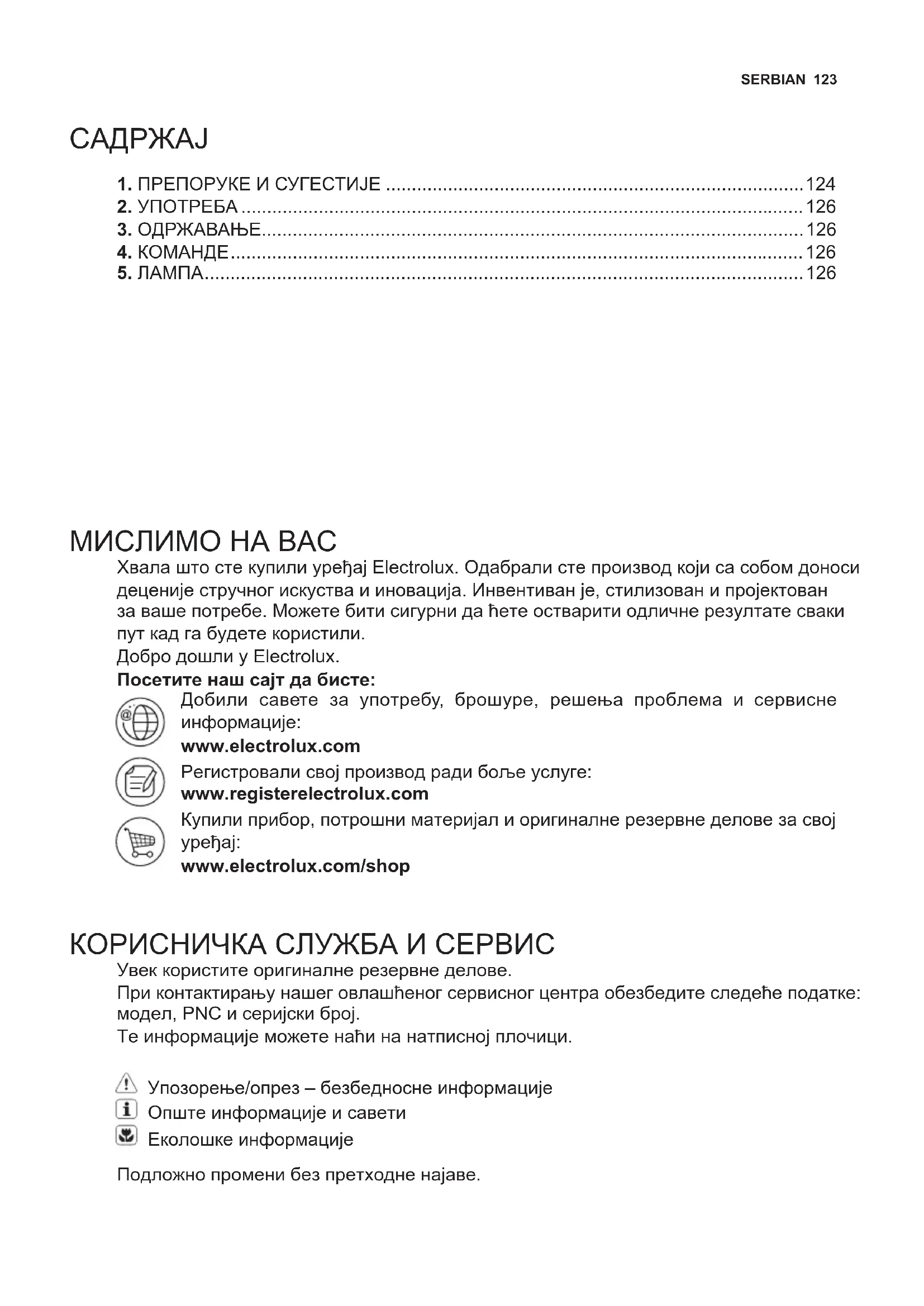 4. КОМАНДЕ ...............................................................................................................126 5. ЛАМПА ....................................................................................................................126 МИСЛИМО НА ВАС Хвала што сте купили уређај Electrolux. Одабрали сте производ који са собом доноси деценије стручног искуства и иновација. Инвентиван је, стилизован и пројектован за ваше потребе. Можете бити сигурни да ћете остварити одличне резултате сваки пут кад га будете користили. Добро дошли у Electrolux. Посетите наш сајт да бисте: Добили савете за употребу, брошуре, решења проблема и сервисне информације: www.electrolux.com Регистровали свој производ ради боље услуге: www.registerelectrolux.com Купили прибор, потрошни материјал и оригиналне резервне делове за свој