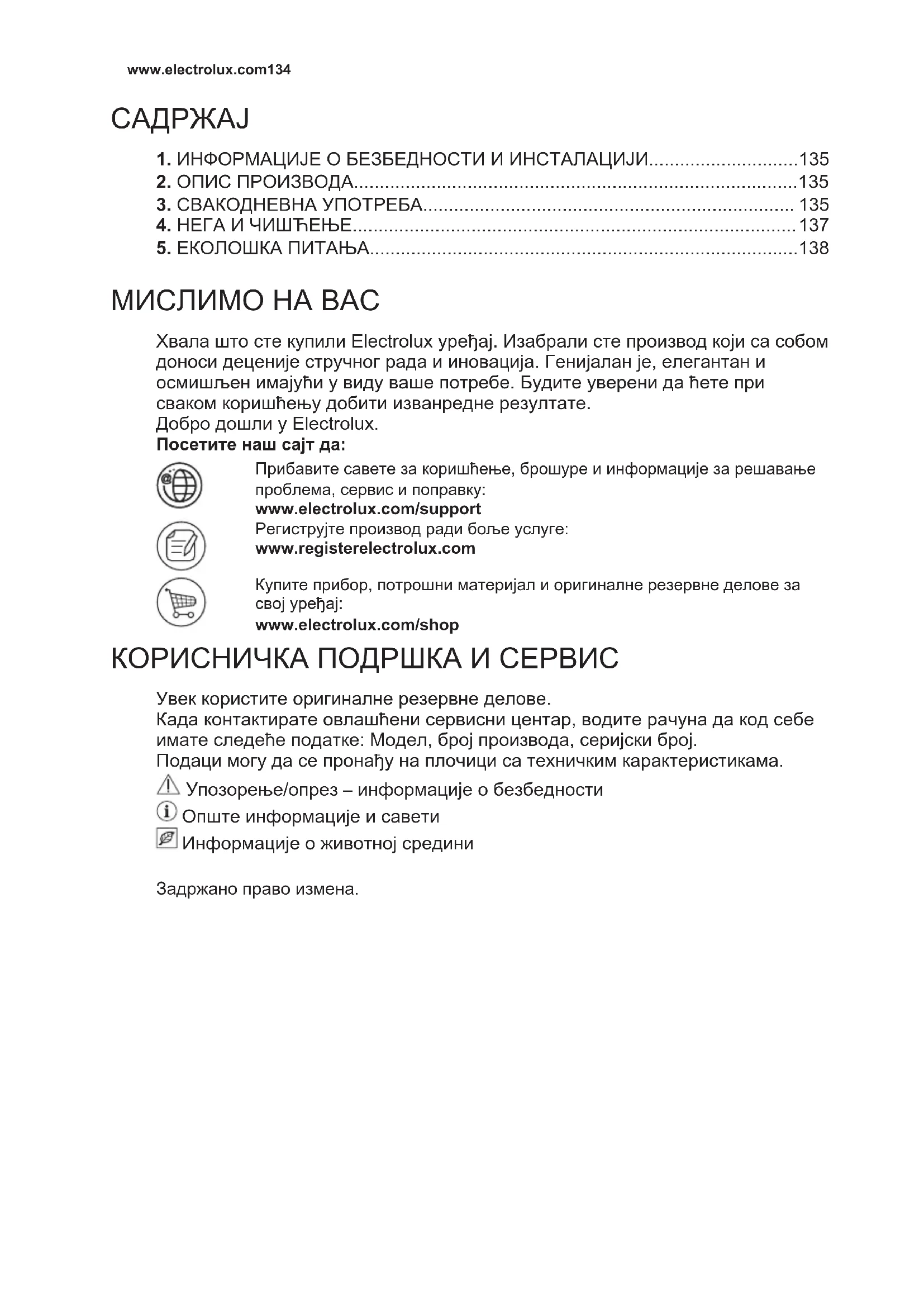 МИСЛИМО НА ВАС Хвала што сте купили Electrolux уређај. Изабрали сте производ који са собом доноси деценије стручног рада и иновација. Генијалан је, елегантан и осмишљен имајући у виду ваше потребе. Будите уверени да ћете при сваком коришћењу добити изванредне резултате. Добро дошли у Electrolux. Посетите наш сајт да: Прибавите савете за коришћење, брошуре и информације за решавање проблема, сервис и поправку: www.electrolux.com/support Региструјте производ ради боље услуге: www.registerelectrolux.com Купите прибор, потрошни материјал и оригиналне резервне делове за свој уређај: www.electrolux.com/shop КОРИСНИЧКА ПОДРШКА И СЕРВИС Увек користите оригиналне резервне делове. Када контактирате овлашћени сервисни центар, водите рачуна да код себе имате следеће податке: Модел, број производа, серијски број. Подаци могу да се пронађу на плочици са техничким карактеристикама. Упозорење/опрез – информације о безбедности Опште информације и савети Информације о животној средини Задржано право измена. www.electrolux.com1341. ИНФОРМАЦИЈЕ О БЕЗБЕДНОСТИ И ИНСТАЛАЦИЈИ