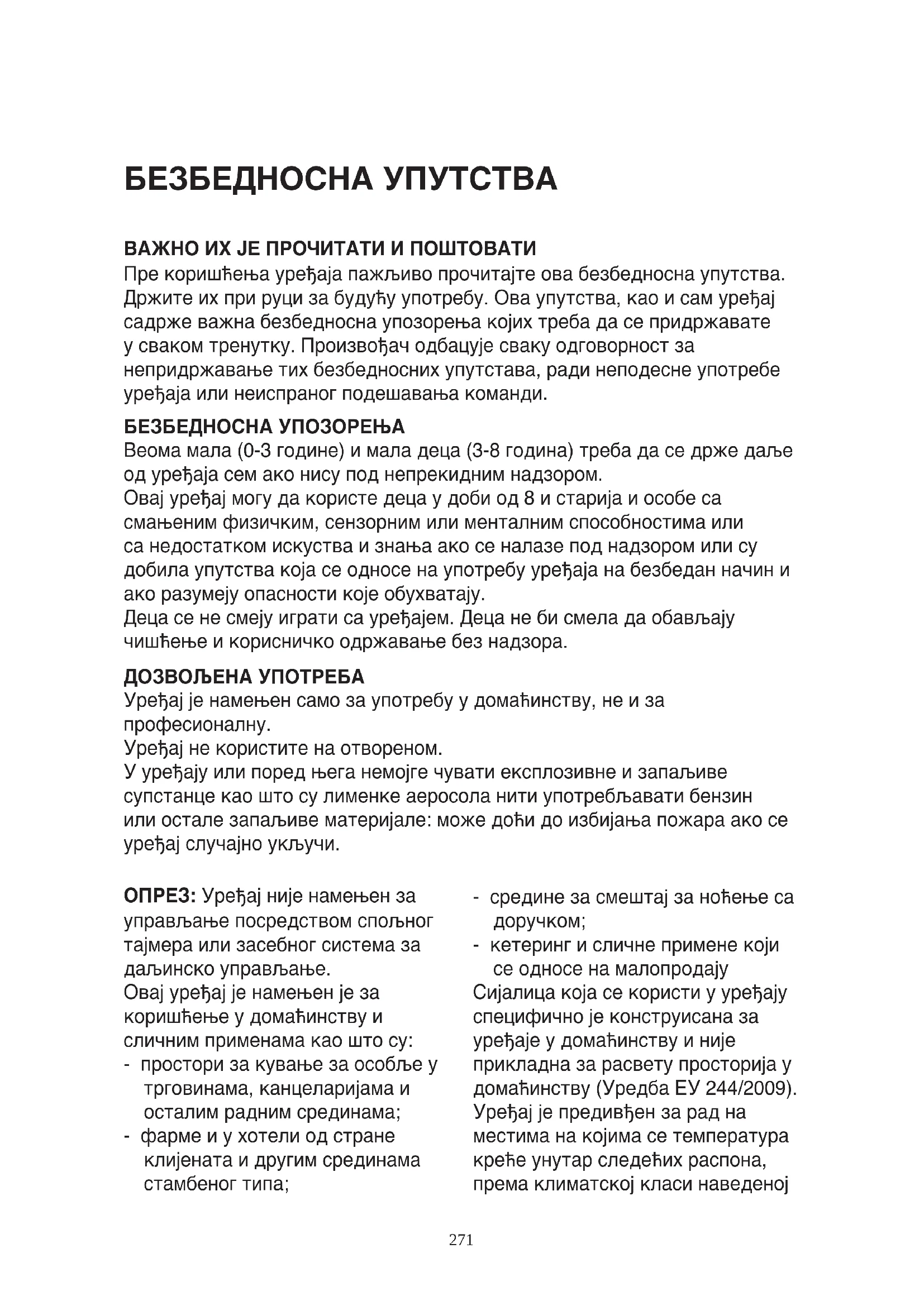 În acest scop, reglați cele două picioare de nivelare din partea din față a unității. Dacă unitatea nu este nivelată, ușile și aliniamentele garniturilor magnetice nu vor acoperite corespunzător.271 БЕЗБЕДНОСНА УПУТСТВА ВАЖНО ИХ ЈЕ ПРОЧИТАТИ И ПОШТОВАТИ Пре коришћења уређаја пажљиво прочитајте ова безбедносна упутства. Држите их при руци за будућу употребу. Ова упутства, као и сам уређај садрже важна безбедносна упозорења којих треба да се придржавате у сваком тренутку. Произвођач одбацује сваку одговорност за непридржавање тих безбедносних упутстава, ради неподесне употребе уређаја или неиспраног подешавања команди. БЕЗБЕДНОСНА УПОЗОРЕЊА Веома мала (0-3 године) и мала деца (3-8 година) треба да се држе даље од уређаја сем ако нису под непрекидним надзором. Овај уређај могу да користе деца у доби од 8 и старија и особе са смањеним физичким, сензорним или менталним способностима или са недостатком искуства и знања ако се налазе под надзором или су добила упутства која се односе на употребу уређаја на безбедан начин и ако разумеју опасности које обухватају. Деца се не смеју играти са уређајем. Деца не би смела да обављају чишћење и корисничко одржавање без надзора. ДОЗВОЉЕНА УПОТРЕБА Уређај је намењен само за употребу у домаћинству, не и за професионалну. Уређај не користите на отвореном. У уређају или поред њега немојге чувати експлозивне и запаљиве супстанце као што су лименке аеросола нити употребљавати бензин или остале запаљиве материјале: може доћи до избијања пожара ако се уређај случајно укључи. ОПРЕЗ: Уређај није намењен за управљање посредством спољног тајмера или засебног система за даљинско управљање. Овај уређај је намењен је за коришћење у домаћинству и сличним применама као што су: - простори за кување за особље у трговинама, канцеларијама и осталим радним срединама; - фарме и у хотели од стране клијената и другим срединама стамбеног типа; - средине за смештај за ноћење са